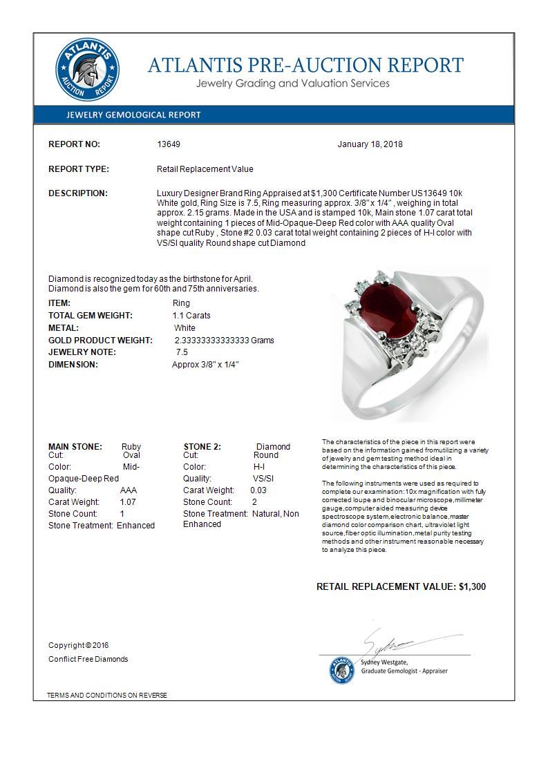 REF-19T6M -13649 ---- 1.10 CTW Ruby & Diamond Ring 10K White Gold ---- Luxury Designer Brand Ring Appraised at $1,300 Certificate Number US13649 10k White gold, Ring Size is 7.5, Ring measuring approx. 3/8" x 1/4" , weighing in total approx. 2.15 grams. Made in the USA and is stamped 10k, Main stone 1.07 carat total weight containing 1 pieces of Mid-Opaque-Deep Red color with AAA quality Oval shape cut Ruby , Stone #2 0.03 carat total weight containing 2 pieces of H-I color with VS/SI quality Round shape cut Diamond