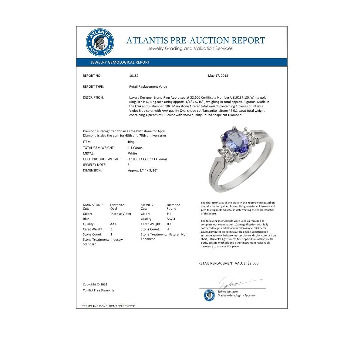 REF-36H2A -10187 ---- 1.10 CTW Tanzanite & Diamond Ring 18K White Gold ---- Luxury Designer Brand Ring Appraised at $2,600 Certificate Number US10187 18k White gold, Ring Size is 6, Ring measuring approx. 1/4" x 5/16" , weighing in total approx. 3 grams. Made in the USA and is stamped 18k, Main stone 1 carat total weight containing 1 pieces of Intense Violet Blue color with AAA quality Oval shape cut Tanzanite , Stone #2 0.1 carat total weight containing 4 pieces of H-I color with VS/SI quality Round shape cut Diamond