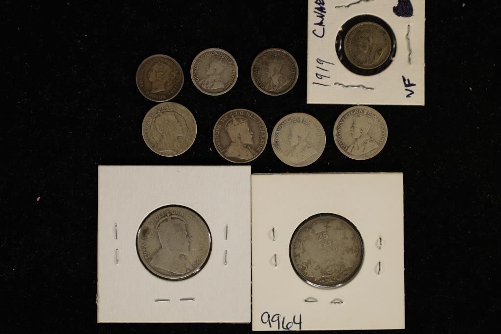 2-1913 & 1919 FIVE CENTS, 1909, 1910, 1913 & 1914 TEN CENTS AND 1910 & 1919 TWENTY FIVE CENTS. .7586 OZ. ASW TOTAL
