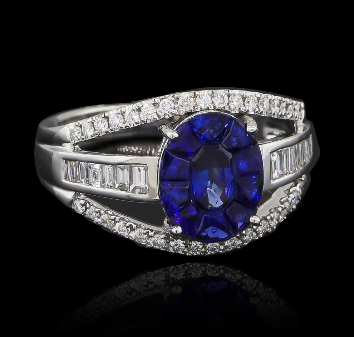 One electronically tested 18KT white gold ladies cast sapphire and diamond ring with a bright polish finish. The ring features a center sapphire gallery supported by diamond ribbon three-way split shoulders, completed by a two millimeter wide band. Identified with markings of "750". Condition is good. Containing: Ten invisible set octagon and trapezoid step cut natural blue sapphires approximate total weight of 1.10ct., clarity is eye clean, type II, medium dark, moderately strong, blue color, (GIA B 6/4), cut is good. Transmitting light with no distortion, transparent. Color grade is an average for the group. Graded in the setting. Twelve channel set baguette cut (tapered) diamonds, measuring from 2.00 x 1.30 x 0.91mm (depth est.) to 2.50 x 1.80 x 1.26mm (depth est.) approximate total weight of 12 Stones = 0.42ct. Graded in the setting. Clarity: VS-1 to SI-1. Color: F - G Thirty-Five prong set round brilliant cut diamonds, measuring 1.20 - 1.20 x 0.72mm (depth est.) approximate total weight of 35 Stones = 0.35ct. Graded in the setting. Clarity: VS-2 to SI-2. Color: E - G. Total Weight of Colored Stones 1.10ct. Total Weight of Diamonds 0.77ct. Total Weight of Ring 6.37gm. AIG Appraised at $5,060.00.