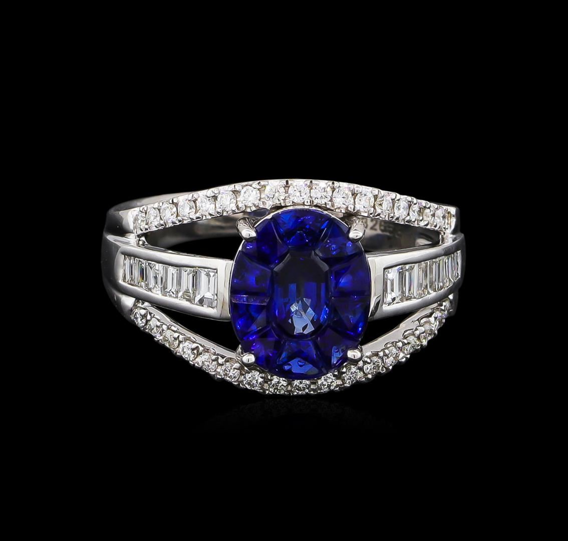 One electronically tested 18KT white gold ladies cast sapphire and diamond ring with a bright polish finish. The ring features a center sapphire gallery supported by diamond ribbon three-way split shoulders, completed by a two millimeter wide band. Identified with markings of "750". Condition is good. Containing: Ten invisible set octagon and trapezoid step cut natural blue sapphires approximate total weight of 1.10ct., clarity is eye clean, type II, medium dark, moderately strong, blue color, (GIA B 6/4), cut is good. Transmitting light with no distortion, transparent. Color grade is an average for the group. Graded in the setting. Twelve channel set baguette cut (tapered) diamonds, measuring from 2.00 x 1.30 x 0.91mm (depth est.) to 2.50 x 1.80 x 1.26mm (depth est.) approximate total weight of 12 Stones = 0.42ct. Graded in the setting. Clarity: VS-1 to SI-1. Color: F - G Thirty-Five prong set round brilliant cut diamonds, measuring 1.20 - 1.20 x 0.72mm (depth est.) approximate total weight of 35 Stones = 0.35ct. Graded in the setting. Clarity: VS-2 to SI-2. Color: E - G. Total Weight of Colored Stones 1.10ct. Total Weight of Diamonds 0.77ct. Total Weight of Ring 6.37gm. AIG Appraised.