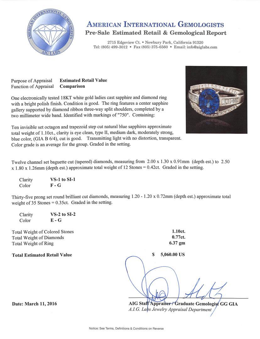 One electronically tested 18KT white gold ladies cast sapphire and diamond ring with a bright polish finish. The ring features a center sapphire gallery supported by diamond ribbon three-way split shoulders, completed by a two millimeter wide band. Identified with markings of "750". Condition is good. Containing: Ten invisible set octagon and trapezoid step cut natural blue sapphires approximate total weight of 1.10ct., clarity is eye clean, type II, medium dark, moderately strong, blue color, (GIA B 6/4), cut is good. Transmitting light with no distortion, transparent. Color grade is an average for the group. Graded in the setting. Twelve channel set baguette cut (tapered) diamonds, measuring from 2.00 x 1.30 x 0.91mm (depth est.) to 2.50 x 1.80 x 1.26mm (depth est.) approximate total weight of 12 Stones = 0.42ct. Graded in the setting. Clarity: VS-1 to SI-1. Color: F - G Thirty-Five prong set round brilliant cut diamonds, measuring 1.20 - 1.20 x 0.72mm (depth est.) approximate total weight of 35 Stones = 0.35ct. Graded in the setting. Clarity: VS-2 to SI-2. Color: E - G. Total Weight of Colored Stones 1.10ct. Total Weight of Diamonds 0.77ct. Total Weight of Ring 6.37gm. AIG Appraised.
