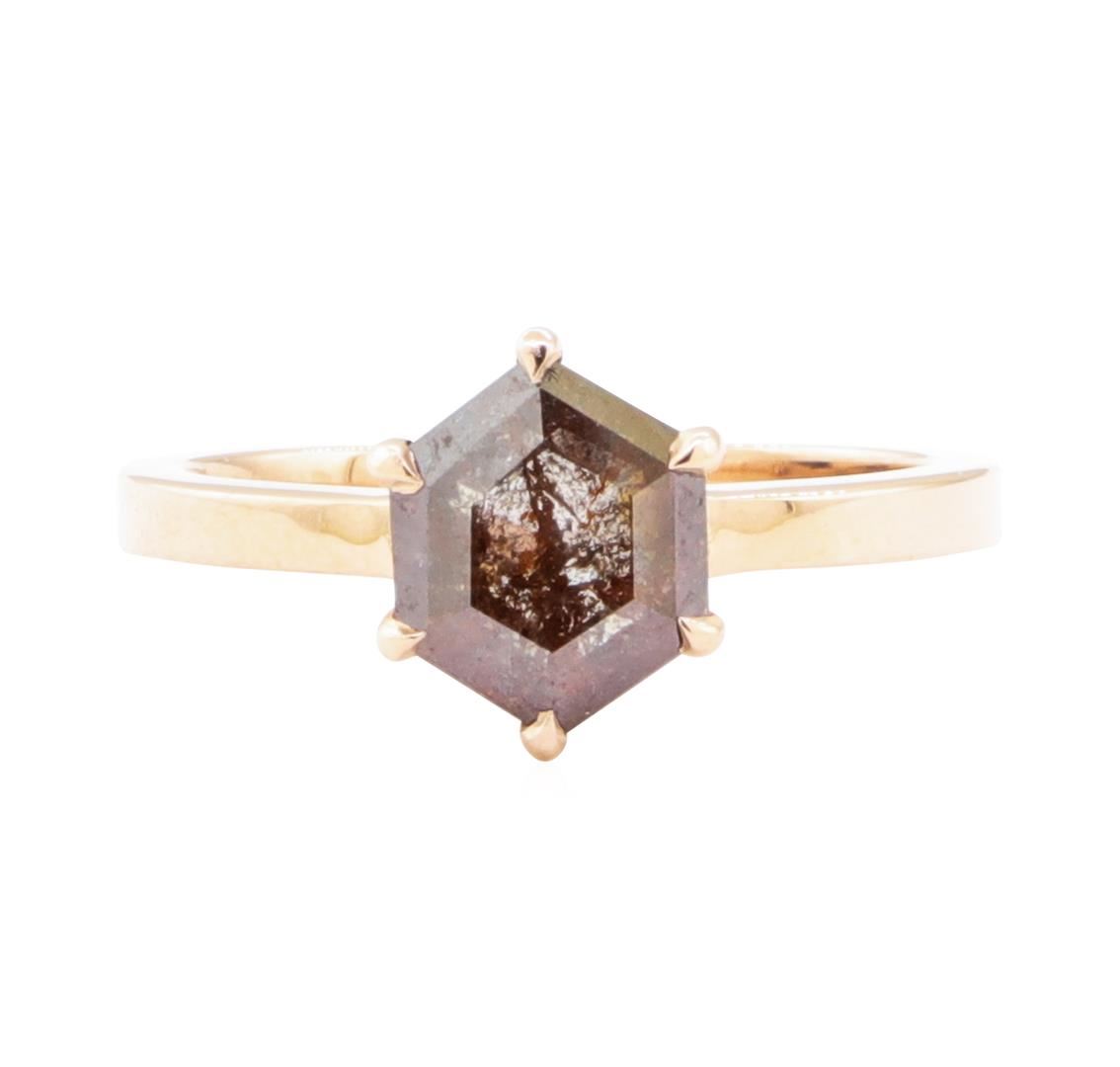 One electronically tested 14KT rose gold lady's cast wedding solitaire ring with a bright polish finish. The featured lady's ring has a shank measuring 1.80 millimeters wide. Identified with markings of '14K'. Condition is new, good workmanship. Containing: One hexagon cut diamond, measuring 7.95 x 6.71 x 3.40mm (depth est.) approximate weight of 1.10ct. Colored gemstones are presumed to have been subjected to commonly used enhancement processes. Graded in the setting. Color Fancy Orangy Brown Clarity I-2. Total Weight of Diamonds 1.10ct.. Total Weight of Ring 2.70gm GAS Appraised at $5845.00. GAS Appraised at $5,845.00.