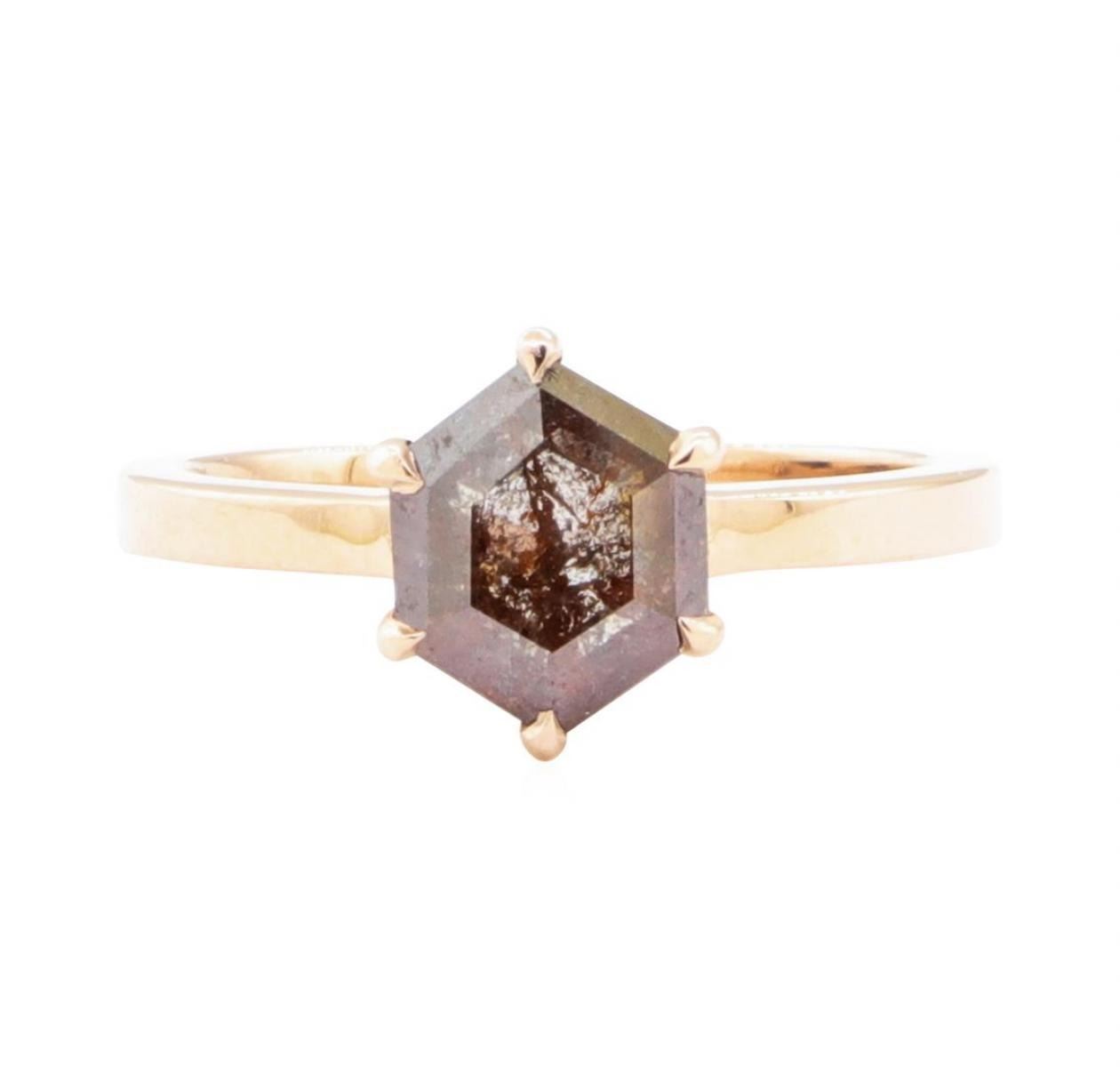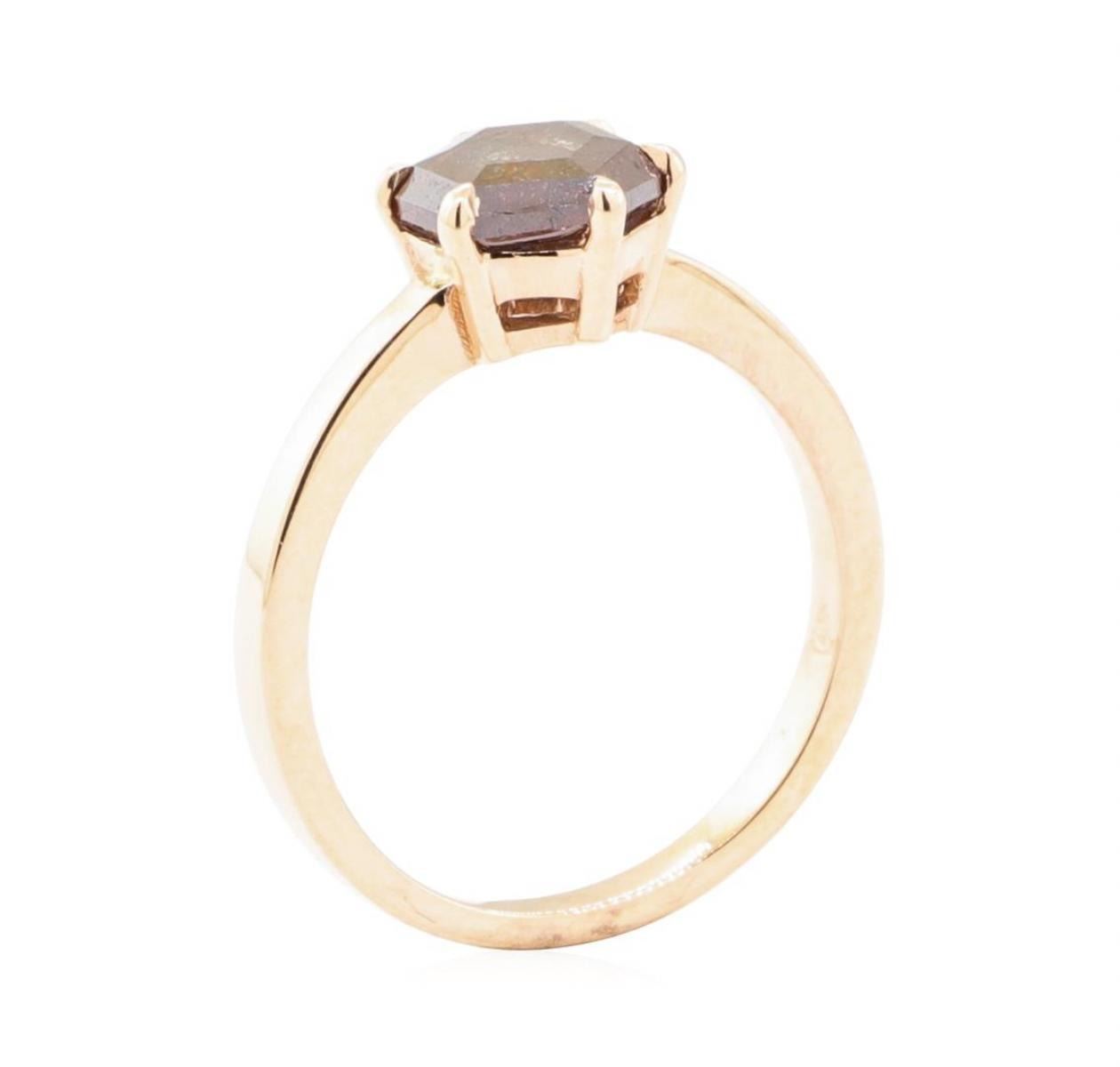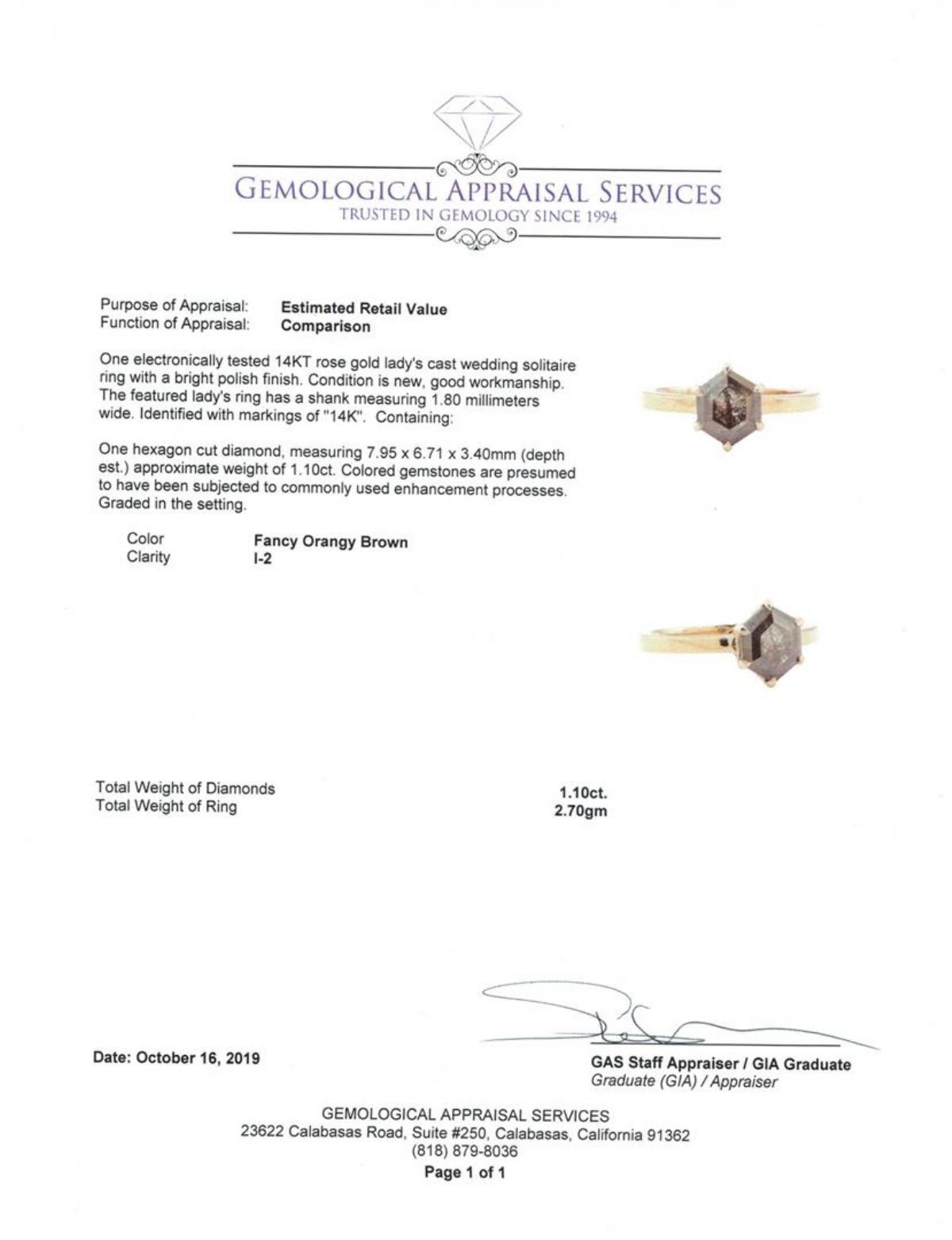 One electronically tested 14KT rose gold lady's cast wedding solitaire ring with a bright polish finish. The featured lady's ring has a shank measuring 1.80 millimeters wide. Identified with markings of '14K'. Condition is new, good workmanship. Containing: One hexagon cut diamond, measuring 7.95 x 6.71 x 3.40mm (depth est.) approximate weight of 1.10ct. Colored gemstones are presumed to have been subjected to commonly used enhancement processes. Graded in the setting. Color Fancy Orangy Brown Clarity I-2. Total Weight of Diamonds 1.10ct.. Total Weight of Ring 2.70gm GAS Appraised at $5845.00. GAS Appraised.