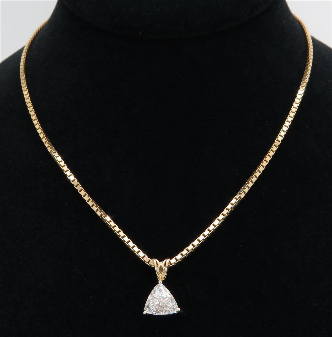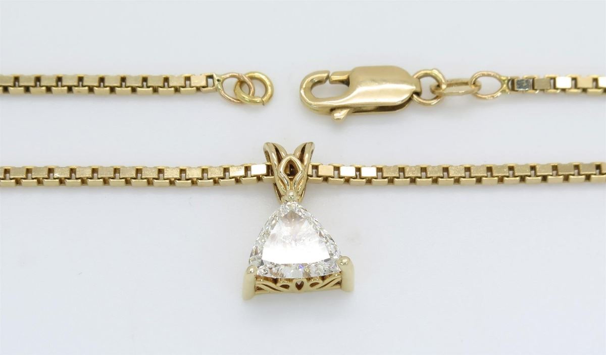 One tested 14K yellow gold diamond pendant. Containing: One Trilliant Cut Diamond. Approximate weight: 1.10CT, Clarity: SI, Color: G-H. Diamonds are graded in the mounting, unless otherwise stated. Weight of necklace: 11.0 grams. Size of chain: 18" long.