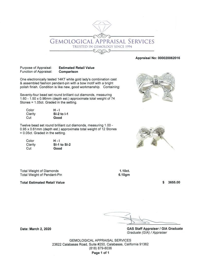 One electronically tested 14KT white gold lady's combination cast & assembled fashion pendant-pin with a bow motif with a bright polish finish. Condition is Good. Containing: Seventy-Four bead set round brilliant cut diamonds, measuring 1.60 - 1.50 x 0.96mm (depth est.) approximate total weight of 74 Stones = 1.05ct. Graded in the setting. Color H - I Clarity SI-2 to I-1 Cut Good Twelve bead set round brilliant cut diamonds, measuring 1.00 - 0.95 x 0.61mm (depth est.) approximate total weight of 12 Stones = 0.05ct. Graded in the setting. Color H - I Clarity SI-1 to SI-2 Cut Good. Total Weight of Diamonds 1.10ct.. Total Weight of Pendant-Pin 6.10gm GAS Appraised at $3655.00. GAS Appraised.