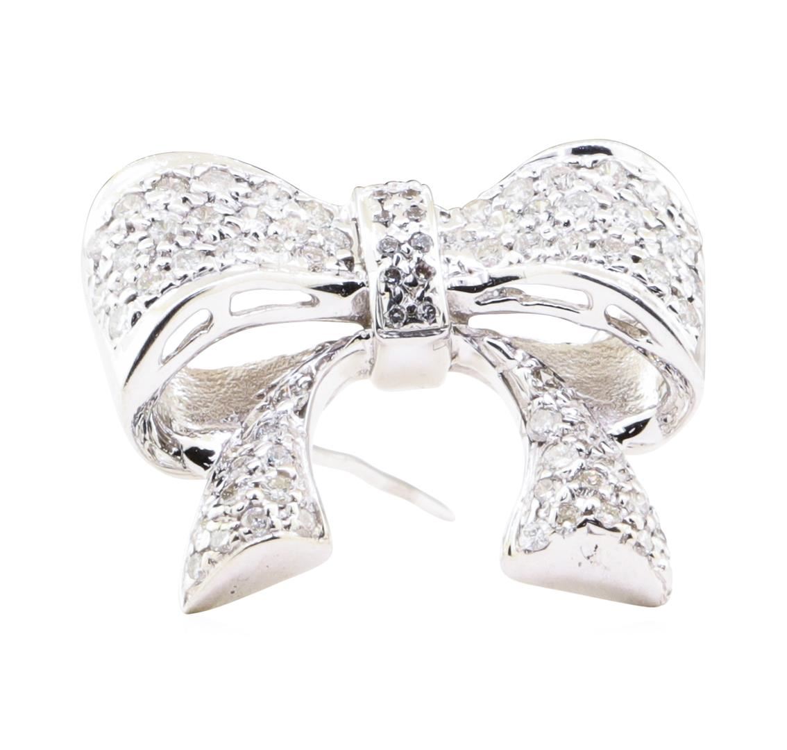 One electronically tested 14KT white gold lady's combination cast & assembled fashion pendant-pin with a bow motif with a bright polish finish. Condition is Good. Containing: Seventy-Four bead set round brilliant cut diamonds, measuring 1.60 - 1.50 x 0.96mm (depth est.) approximate total weight of 74 Stones = 1.05ct. Graded in the setting. Color H - I Clarity SI-2 to I-1 Cut Good Twelve bead set round brilliant cut diamonds, measuring 1.00 - 0.95 x 0.61mm (depth est.) approximate total weight of 12 Stones = 0.05ct. Graded in the setting. Color H - I Clarity SI-1 to SI-2 Cut Good. Total Weight of Diamonds 1.10ct.. Total Weight of Pendant-Pin 6.10gm GAS Appraised at  $3655.00. GAS Appraised.