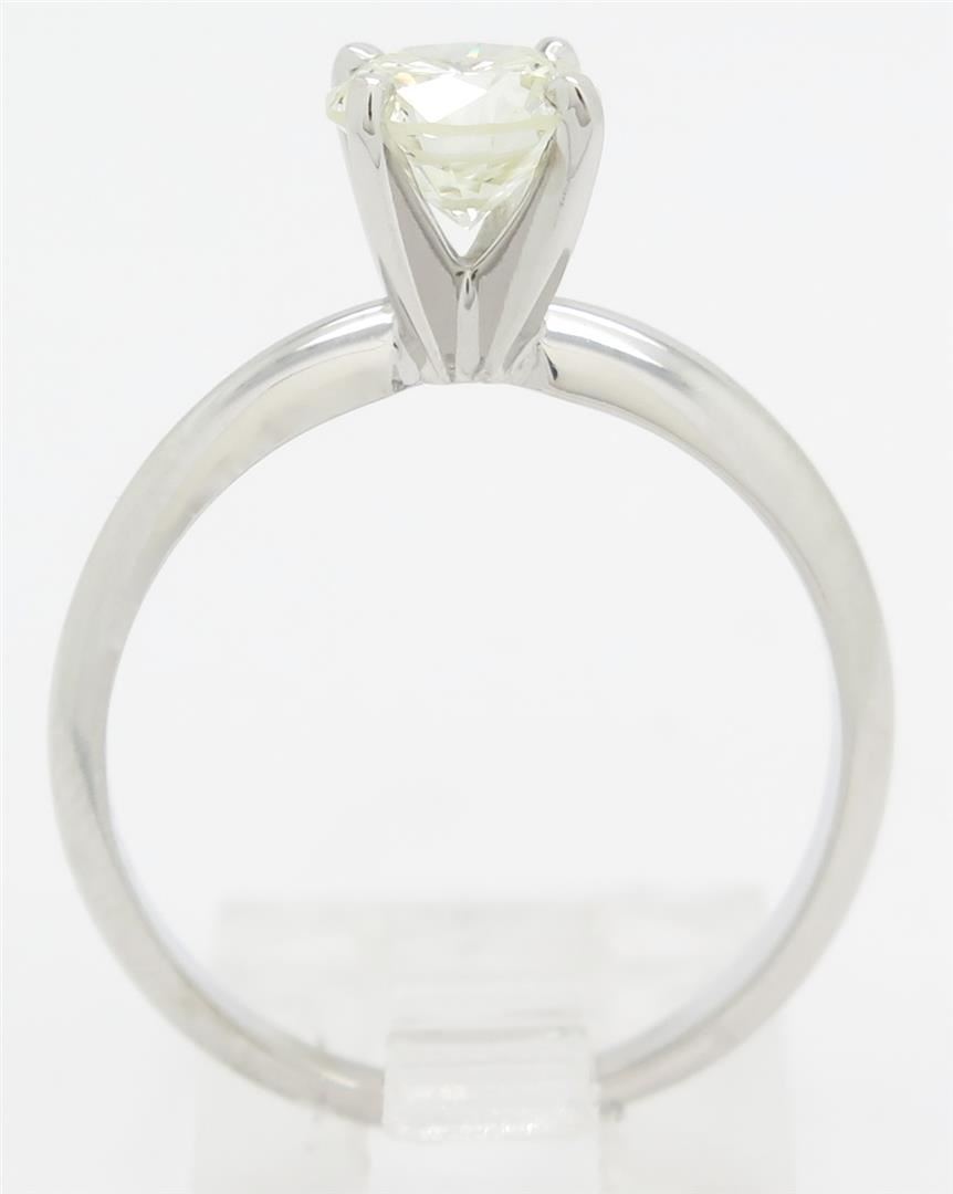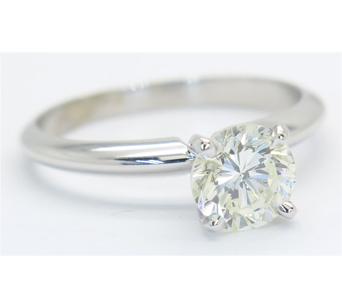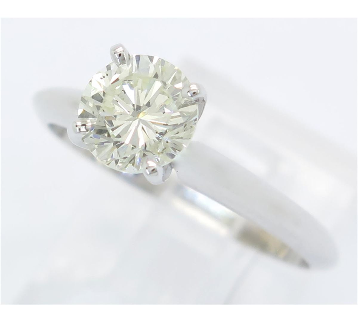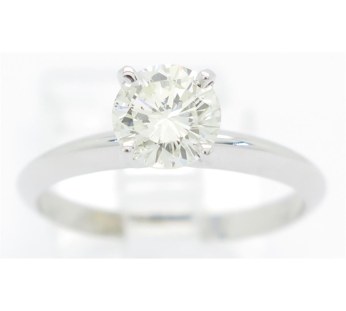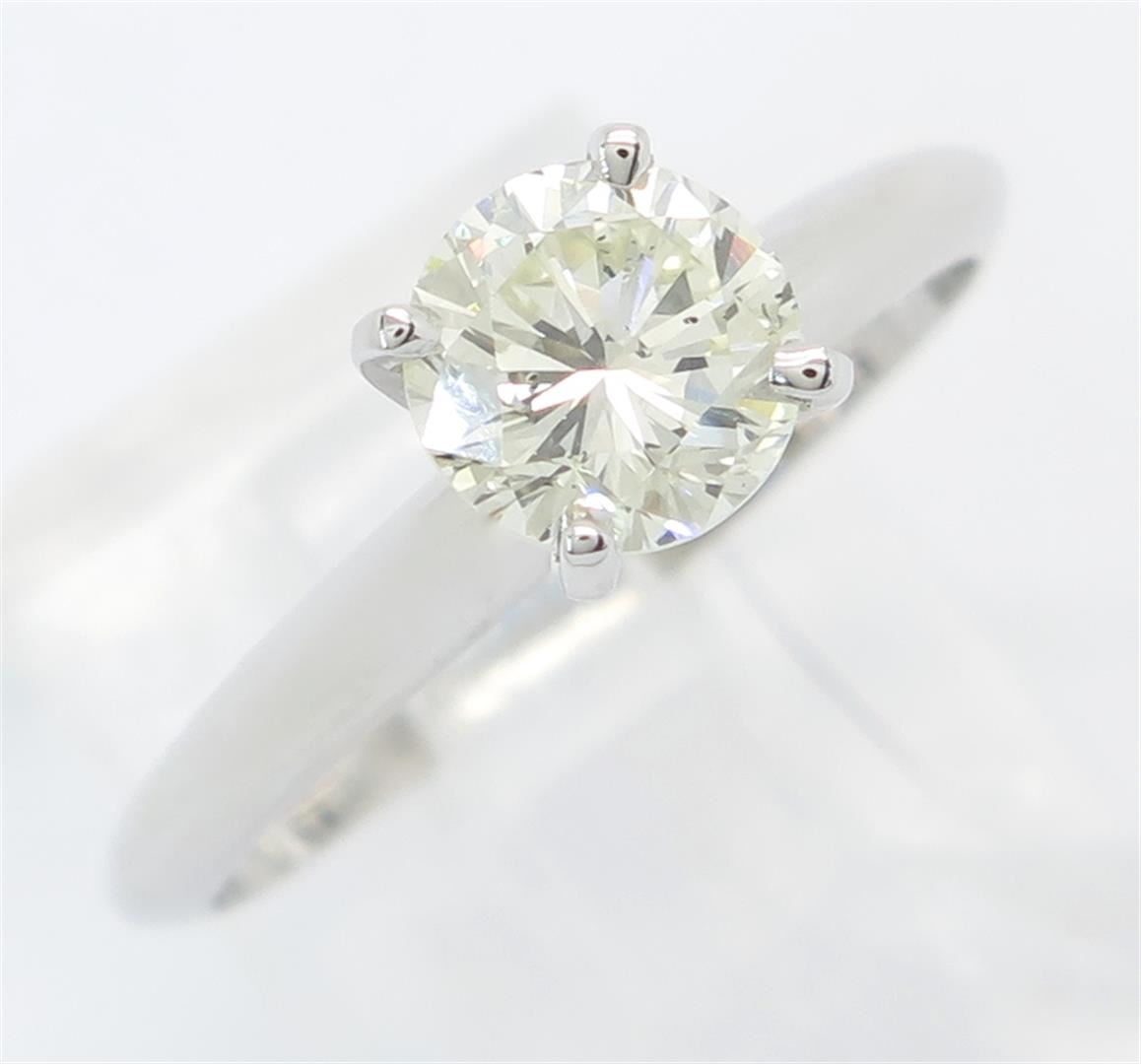 One tested 14K white gold diamond ring. Containing: One Round Brilliant Cut Diamond. Approximate size: 1.10CT, Clarity: I1, Color: M. Diamonds are graded in the mounting, unless otherwise stated. Weight: 2.6 grams. Size: 7.0