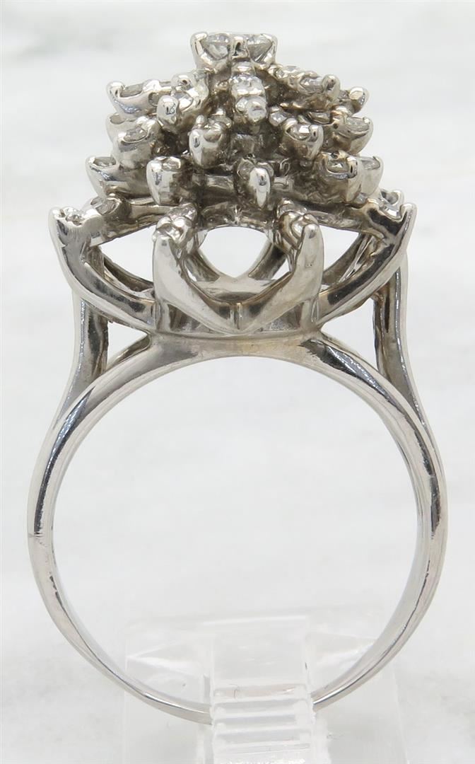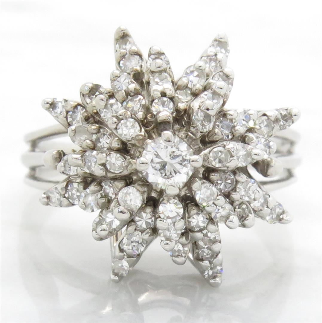 One tested 14K white gold diamond ring. Containing: 1 Round Brilliant Cut Diamond, 64 Single Cut Diamonds. Approximate total diamond weight: 1.10CTW. Diamonds are graded in the mounting, unless otherwise stated. Weight: 9.4 grams. Size: 8.5