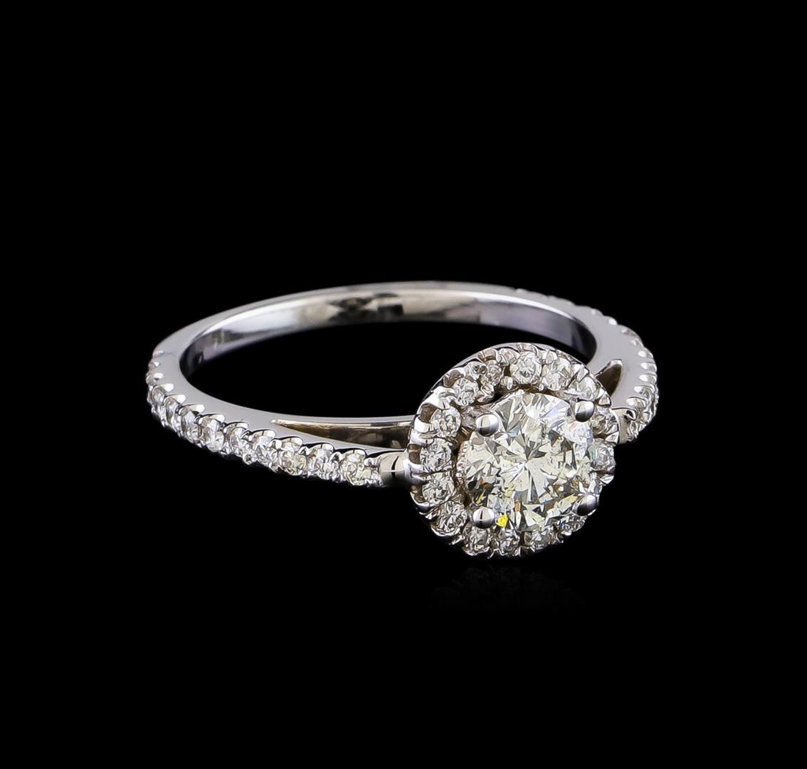 One electronically tested 14KT white gold lady's cast wedding ring with a cathedral halo with a bright polish finish. The featured lady's ring has a shank measuring 1.56 millimeters in width. Identified with markings of "14K". Condition is new, good workmanship. Containing: One prong set round brilliant cut diamond, measuring 5.60 - 5.57 x 3.58mm (depth est.) approximate weight of 0.70ct. Graded in the setting. Clarity: SI-2. Color: I. Cut Very Good Forty prong set round brilliant cut diamonds, measuring 1.40 - 1.30 x 0.84mm (depth est.) approximate total weight of 40 Stones = 0.40ct. Graded in the setting. Clarity: SI-1 to SI-2. Color: G - Good. Total Weight of Diamonds 1.10ct. Total Weight of Ring 2.80gm. GAS Appraised at $7,600.00.