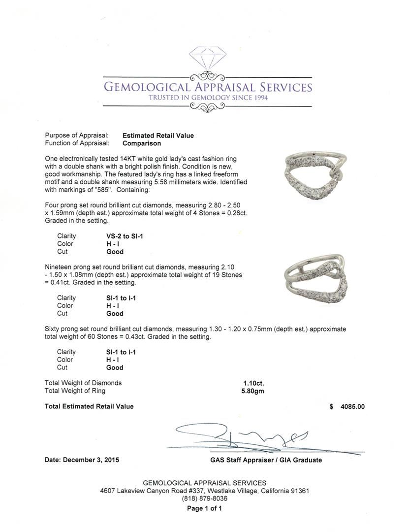 One electronically tested 14KT white gold lady's cast fashion ring with a double shank with a bright polish finish. The featured lady's ring has a linked freeform motif and a double shank measuring 5.58 millimeters wide. Identified with markings of "585". Condition is new, good workmanship. Containing: Four prong set round brilliant cut diamonds, measuring 2.80 - 2.50 x 1.59mm (depth est.) approximate total weight of 4 Stones = 0.26ct. Graded in the setting. Clarity: VS-2 to SI-1. Color: H - I. Cut Good Nineteen prong set round brilliant cut diamonds, measuring 2.10 - 1.50 x 1.08mm (depth est.) approximate total weight of 19 Stones = 0.41ct. Graded in the setting. Clarity: SI-1 to I-1. Color: H - I. Cut Good Sixty prong set round brilliant cut diamonds, measuring 1.30 - 1.20 x 0.75mm (depth est.) approximate total weight of 60 Stones = 0.43ct. Graded in the setting. Clarity: SI-1 to I-1. Color: H - I. Cut Good. Total Weight of Diamonds 1.10ct. Total Weight of Ring 5.80gm. GAS Appraised at $4,085.00. GAS Appraised at $4,085.00.