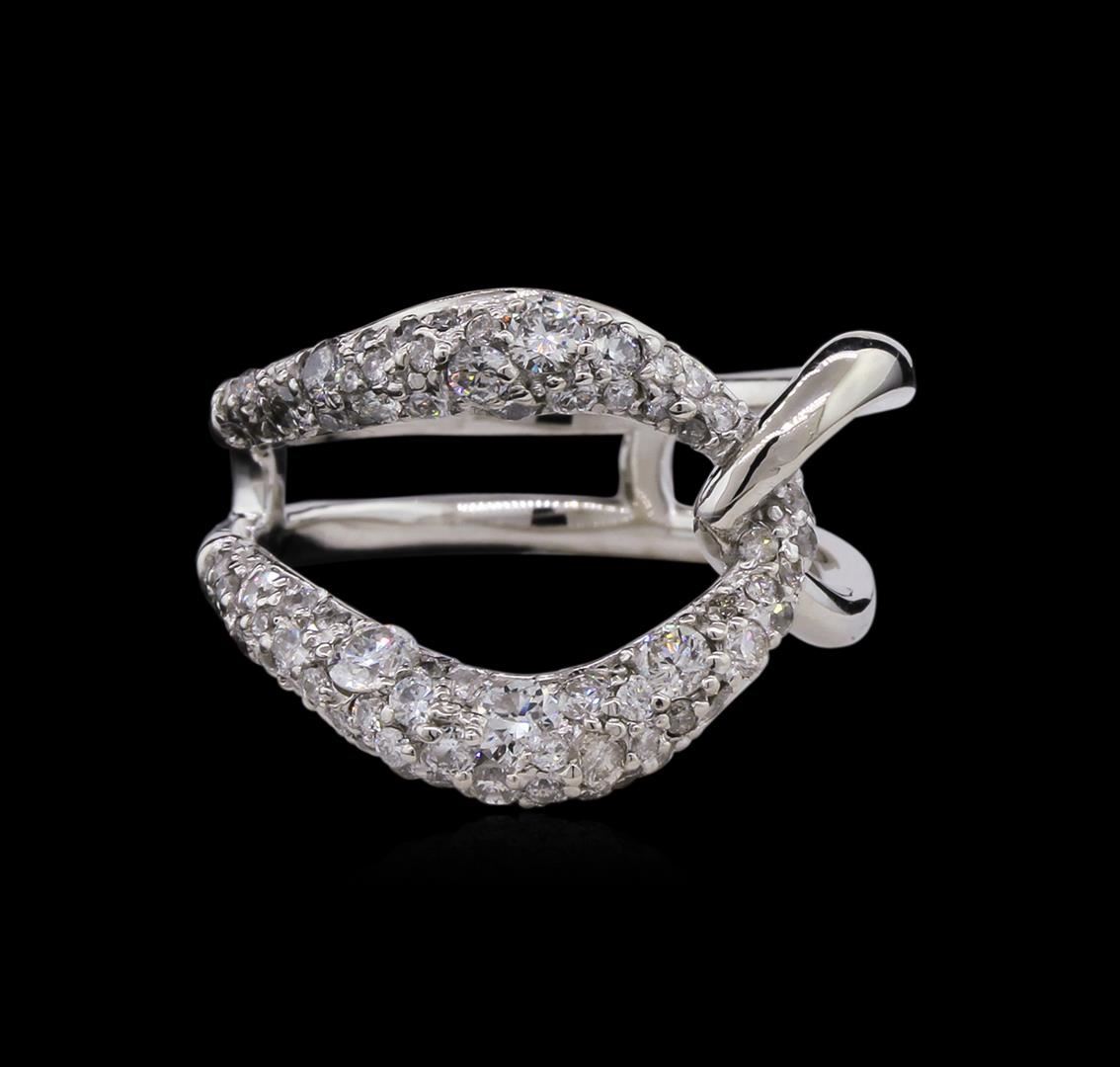 One electronically tested 14KT white gold lady's cast fashion ring with a double shank with a bright polish finish. The featured lady's ring has a linked freeform motif and a double shank measuring 5.58 millimeters wide. Identified with markings of "585". Condition is new, good workmanship. Containing: Four prong set round brilliant cut diamonds, measuring 2.80 - 2.50 x 1.59mm (depth est.) approximate total weight of 4 Stones = 0.26ct. Graded in the setting. Clarity: VS-2 to SI-1. Color: H - I. Cut Good Nineteen prong set round brilliant cut diamonds, measuring 2.10 - 1.50 x 1.08mm (depth est.) approximate total weight of 19 Stones = 0.41ct. Graded in the setting. Clarity: SI-1 to I-1. Color: H - I. Cut Good Sixty prong set round brilliant cut diamonds, measuring 1.30 - 1.20 x 0.75mm (depth est.) approximate total weight of 60 Stones = 0.43ct. Graded in the setting. Clarity: SI-1 to I-1. Color: H - I. Cut Good. Total Weight of Diamonds 1.10ct. Total Weight of Ring 5.80gm. GAS Appraised at $4,085.00. GAS Appraised at $4,085.00.