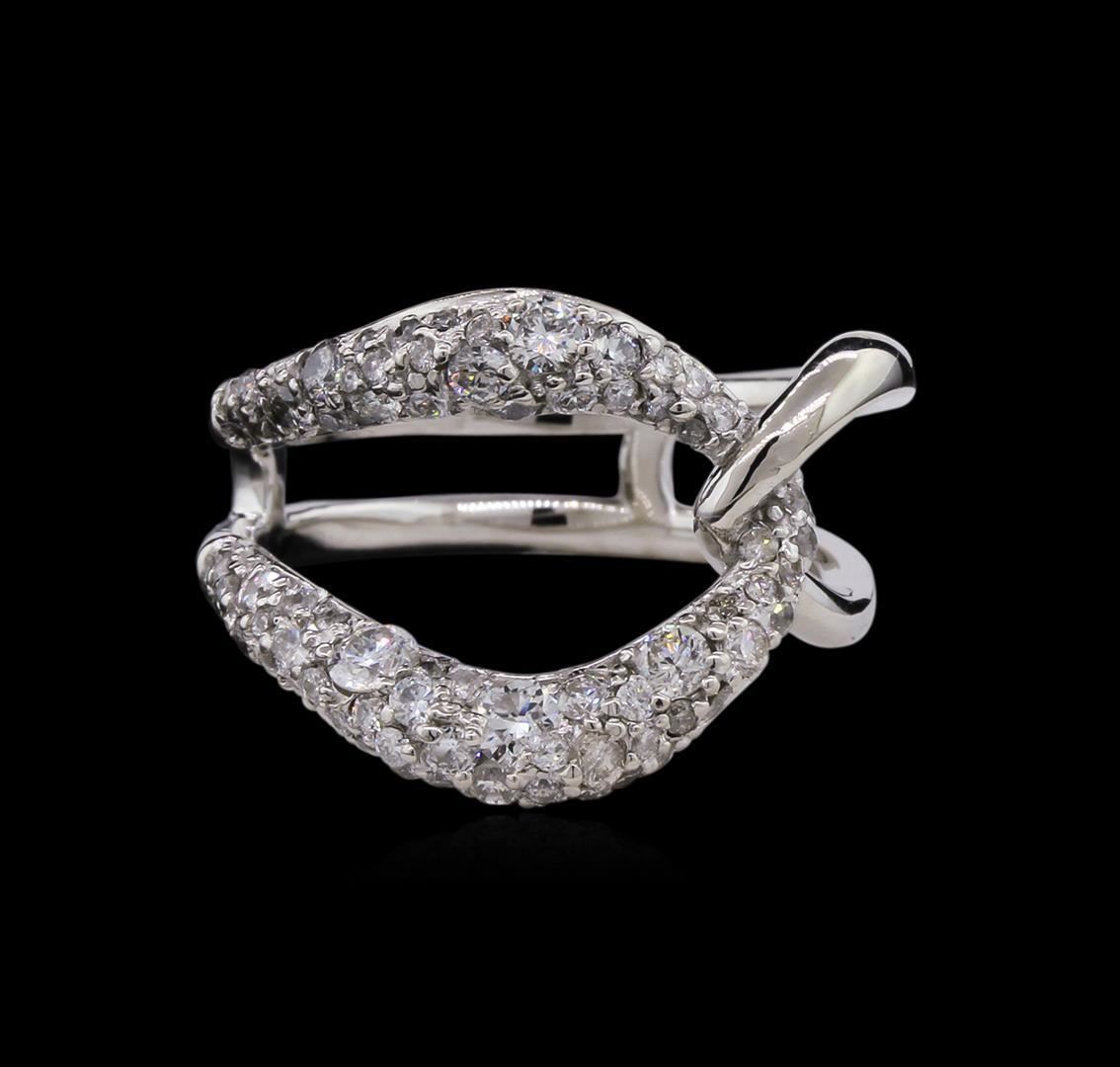 One electronically tested 14KT white gold lady's cast fashion ring with a double shank with a bright polish finish. The featured lady's ring has a linked freeform motif and a double shank measuring 5.58 millimeters wide. Identified with markings of "585". Condition is new, good workmanship. Containing: Four prong set round brilliant cut diamonds, measuring 2.80 - 2.50 x 1.59mm (depth est.) approximate total weight of 4 Stones = 0.26ct. Graded in the setting. Clarity: VS-2 to SI-1. Color: H - I. Cut Good Nineteen prong set round brilliant cut diamonds, measuring 2.10 - 1.50 x 1.08mm (depth est.) approximate total weight of 19 Stones = 0.41ct. Graded in the setting. Clarity: SI-1 to I-1. Color: H - I. Cut Good Sixty prong set round brilliant cut diamonds, measuring 1.30 - 1.20 x 0.75mm (depth est.) approximate total weight of 60 Stones = 0.43ct. Graded in the setting. Clarity: SI-1 to I-1. Color: H - I. Cut Good. Total Weight of Diamonds 1.10ct. Total Weight of Ring 5.80gm. GAS Appraised at $4,085.00. GAS Appraised.
