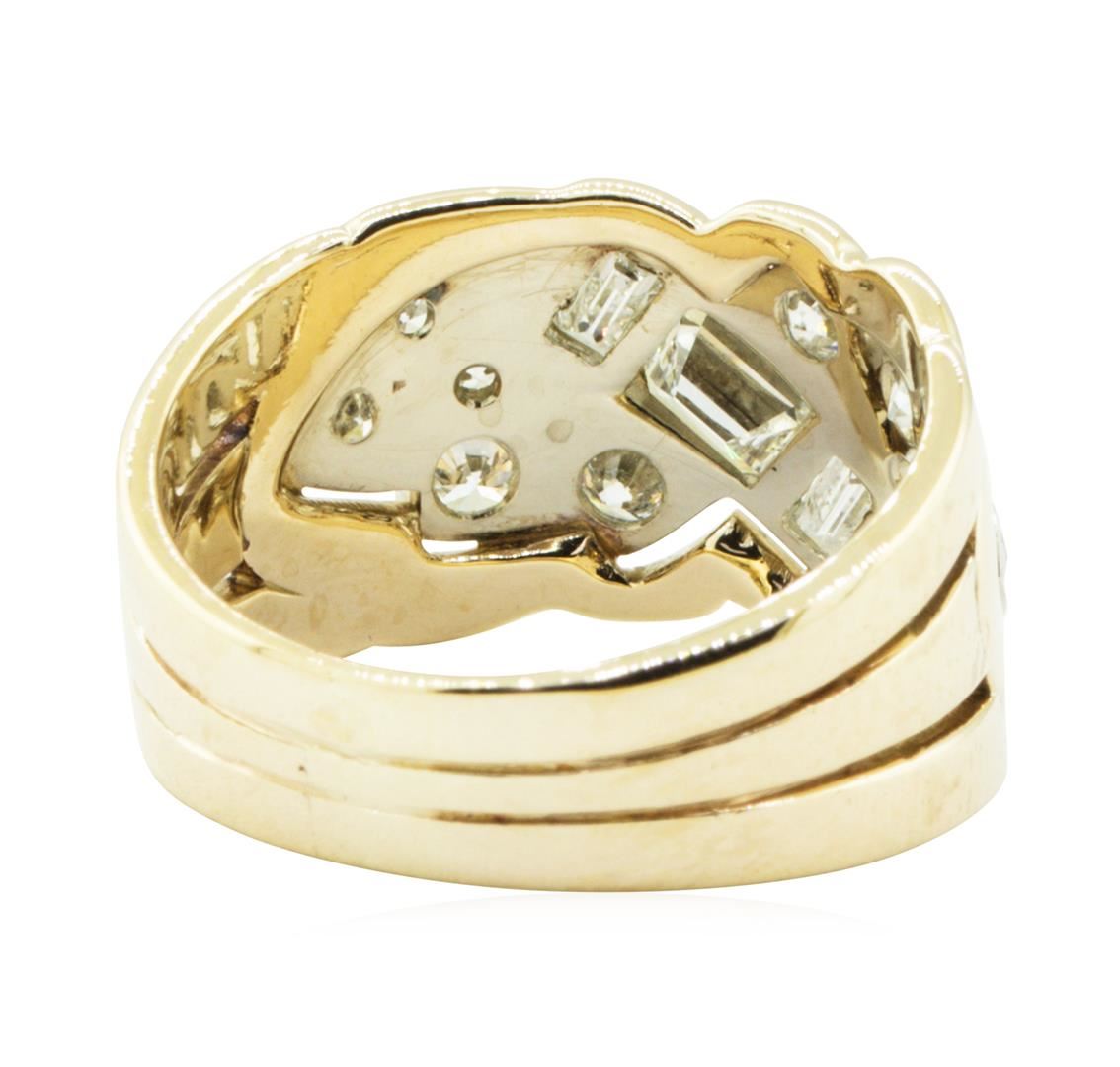 One electronically tested 14KT yellow and white gold lady's combination cast & assembled fashion wide band three row ring with a bright polish finish. The featured lady's ring has a triple shank measuring 5.60 millimeters in width. Identified with markings of '14K'. Condition is used, good workmanship. Containing: One channel set emerald cut diamond, measuring 5.00 x 3.60 x 2.80mm (depth est.) approximate weight of 0.48ct. Graded in the setting. Color I Clarity VS-1 Cut Very Good Two channel set baguette cut diamonds, measuring from 3.65 x 2.00 x 1.70mm (depth est.) to 3.70 x 2.10 x 1.78mm (depth est.) approximate total weight of 2 Stones = 0.25ct. Diamond has very small chip. Graded in the setting. Color H - I Clarity SI-1 to SI-2 Cut Very Good Six prong set round brilliant cut diamonds, measuring 2.50 - 1.80 x 1.33mm (depth est.) approximate total weight of 6 Stones = 0.22ct. Graded in the setting. Color H - I Clarity VS-2 to SI-1 Cut Good Four prong set single cut diamonds, measuring 2.20 - 2.00 x 1.26mm (depth est.) approximate total weight of 4 Stones = 0.15ct. Graded in the setting. Color H - I Clarity SI-1 to SI-2 Cut Good. Total Weight of Diamonds 1.10ct.. Total Weight of Ring 7.30gm GAS Appraised at $4315.00. GAS Appraised.