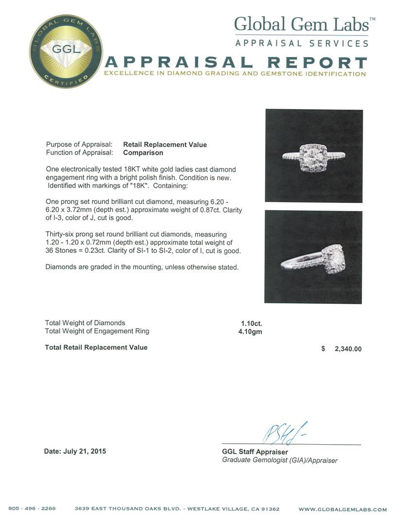 One electronically tested 18KT white gold ladies cast diamond engagement ring with a bright polish finish. Identified with markings of "18K". Condition is new. Containing: One prong set round brilliant cut diamond, measuring 6.20 - 6.20 x 3.72mm (depth est.) approximate weight of 0.87ct. Clarity: I-3. Color: J, Cut is Good. Thirty-Six prong set round brilliant cut diamonds, measuring 1.20 - 1.20 x 0.72mm (depth est.) approximate total weight of 36 Stones = 0.23ct. Clarity: SI-1 to SI-2. Color: I, Cut is Good. Diamonds are graded in the mounting, unless otherwise stated. Total Weight of Diamonds 1.10ct. Total Weight of Engagement Ring 4.10gm. GGL Appraised at $2,340.00.