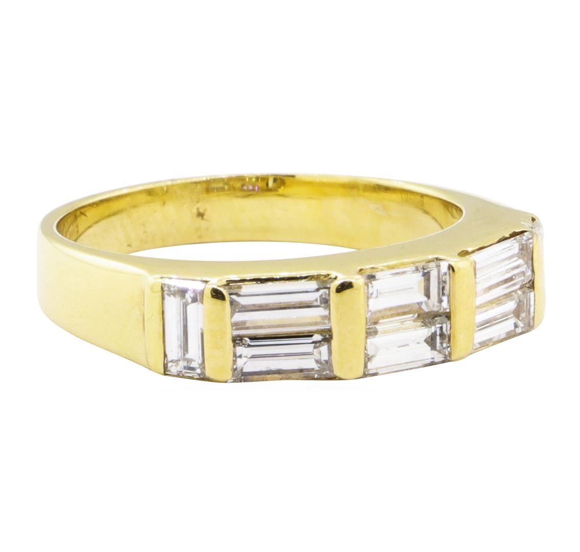 One electronically tested 18KT yellow gold lady's cast wedding ring with a bright polish finish. The featured lady's ring has a shank measuring 2.85 millimeters wide. Condition is Good. Containing: Six channel set baguette cut diamonds, measuring from 4.30 x 2.00 x 1.70mm (depth est.) to 4.40 x 2.20 x 1.87mm (depth est.) approximate total weight of 6 Stones = 0.90ct. Graded in the setting. Color G - H Clarity VS-1 to VS-2 Cut Very Good Two channel set baguette cut diamonds, measuring from 3.90 x 2.00 x 1.70mm (depth est.) to 4.00 x 2.00 x 1.70mm (depth est.) approximate total weight of 2 Stones = 0.20ct. Graded in the setting. Color G - H Clarity VS-1 to VS-2 Cut Very Good. Total Weight of Diamonds 1.10ct.. Total Weight of Ring 5.10gm GAS Appraised at $5300.00. GAS Appraised at $5,300.00.