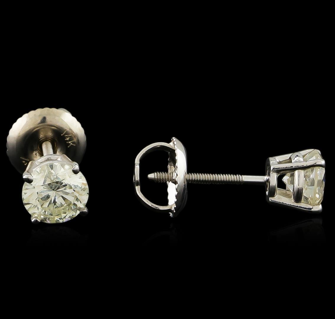 One pair electronically tested 14KT white gold cast & assembled diamond solitaire earrings with screw backs. Identified with markings of "14K". Condition is new, good workmanship. Containing: One prong set round brilliant cut diamond, measuring 5.30 - 5.27 x 3.20mm (depth est.) approximate weight of 0.56ct with a medium strong blue fluorescence. Graded in the setting. Clarity: I-2. Color: 60.5%. Table 56.7%. One prong set round brilliant cut diamond, measuring 5.10 - 5.10 x 3.20mm (depth est.), 3.00.%. GTCF approximate weight of 0.54ct. Naturally occurring internal & external characteristics are present, including surface cavities. Graded in the setting. Clarity: I-2. Color: 62.8%. Table 62.0%. Total Weight of Diamonds 1.10ct. Total Weight of Earrings 0.95gm. AIG Appraised at $3,685.00.