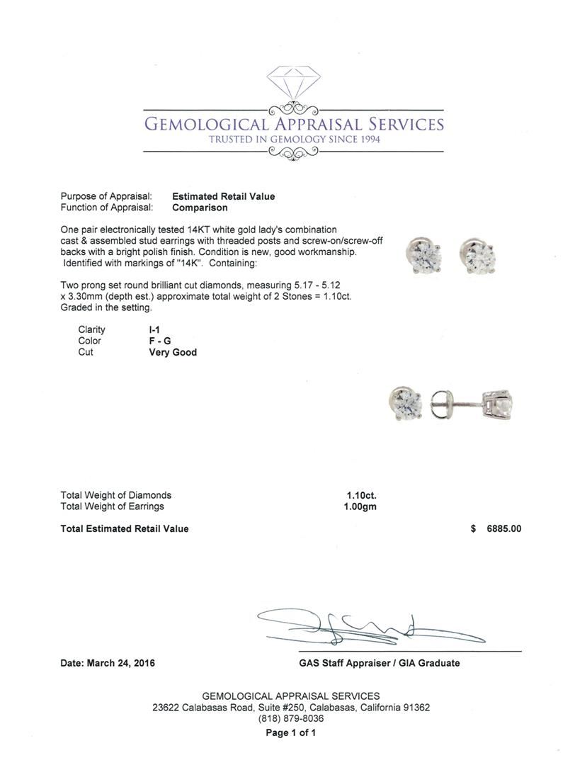 One pair electronically tested 14KT white gold lady's combination cast & assembled stud earrings with threaded posts and screw-on/screw-off backs with a bright polish finish. Identified with markings of "14K". Condition is new, good workmanship. Containing: Two prong set round brilliant cut diamonds, measuring 5.17 - 5.12 x 3.30mm (depth est.) approximate total weight of 2 Stones = 1.10ct. Graded in the setting. Clarity: I-1. Color: F - Very Good. Total Weight of Diamonds 1.10ct. Total Weight of Earrings 1.00gm. GAS Appraised at $6,885.00.