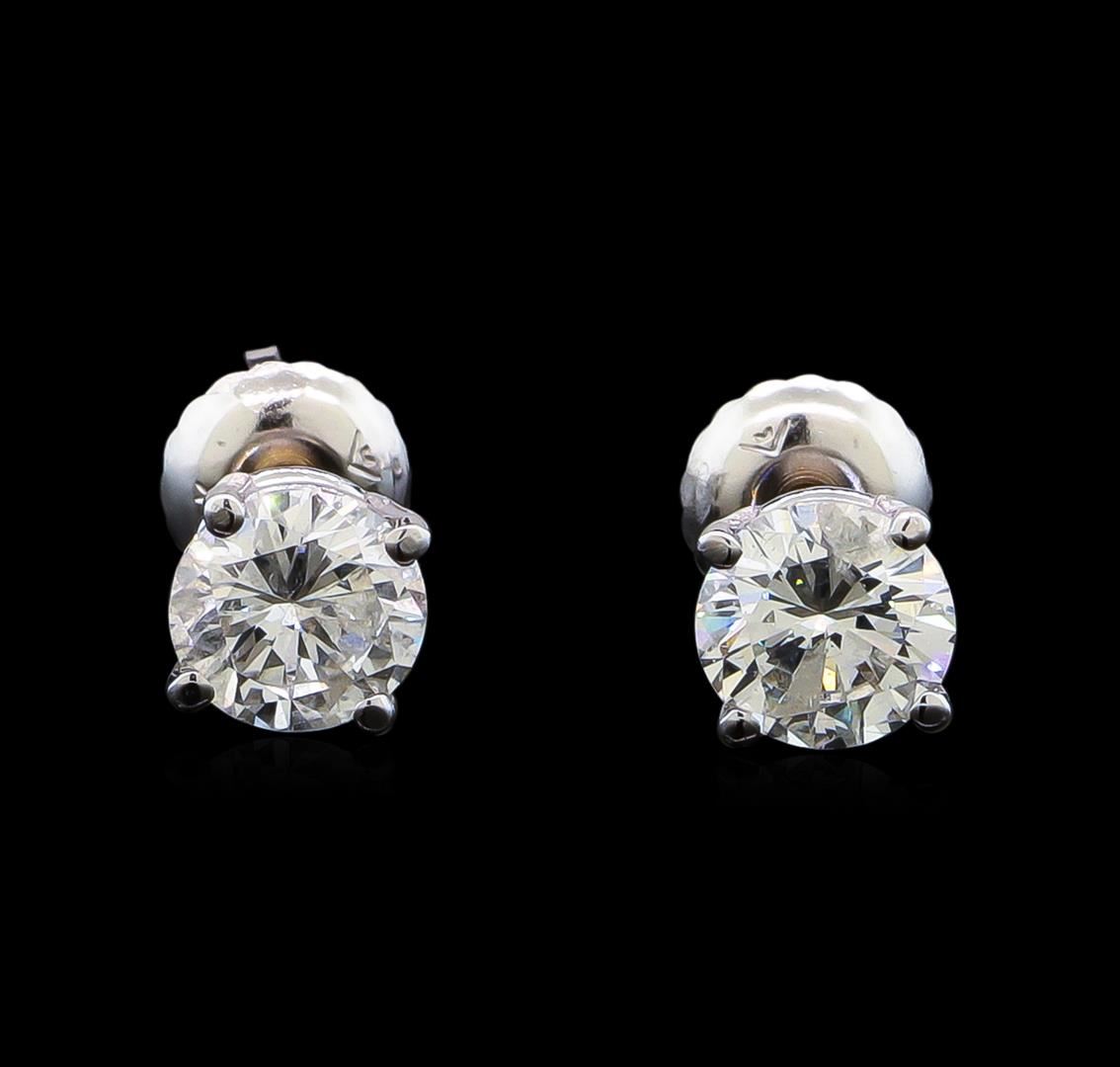 One pair electronically tested 14KT white gold lady's combination cast & assembled diamond stud earrings with threaded posts and screw-on/screw-off backs with a basket setting with a bright polish finish. Identified with markings of "14K". Condition is new, good workmanship. Containing: One prong set round brilliant cut diamond, measuring 5.45 - 5.42 x 3.26mm (depth est.) approximate weight of 0.58ct. Graded in the setting. Clarity: I-1. Color: Good One prong set round brilliant cut diamond, measuring 5.39 - 5.36 x 3.23mm (depth est.) approximate weight of 0.52ct. Graded in the setting. Clarity: SI-2. Color: Good. Total Weight of Diamonds 1.10ct. Total Weight of Stud Earrings 1.00gm. GAS Appraised at $6,090.00.