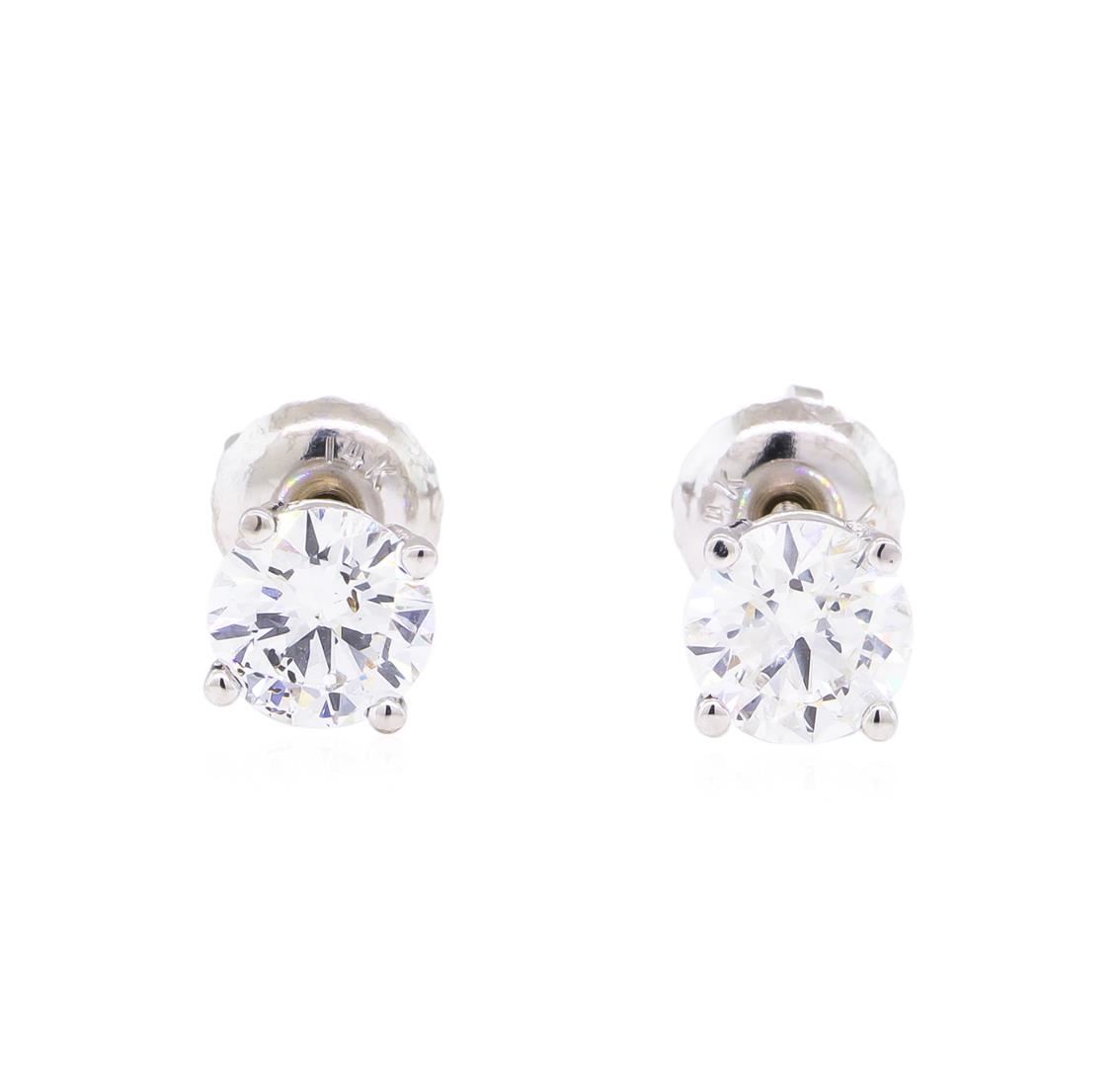 One pair electronically tested 14KT white gold lady's combination cast & assembled stud earrings with threaded posts and screw-on/screw-off backs with a bright polish finish. Identified with markings of "14K". Condition is new, good workmanship. Containing: Two prong set round brilliant cut diamonds, measuring 5.25 - 5.15 x 3.33mm (depth est.) approximate total weight of 2 Stones = 1.10ct. Graded in the setting. Clarity: SI-1 to SI-2. Color: F - Very Good. Total Weight of Diamonds 1.10ct. Total Weight of Earrings 1.00gm. GAS Appraised at $8,330.00.