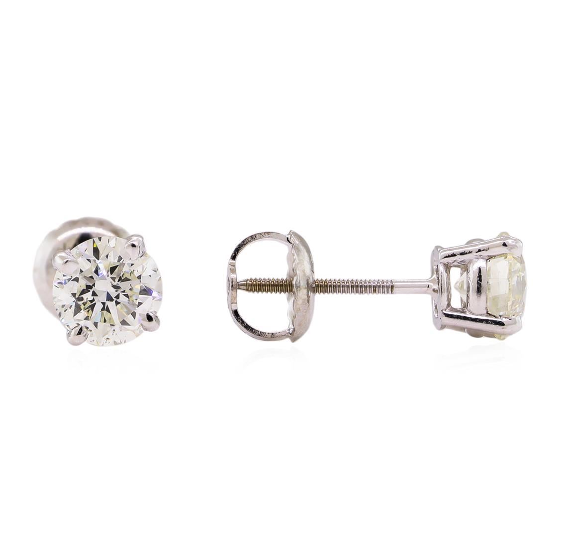 One pair electronically tested 14KT white gold lady's combination cast & assembled stud earrings with threaded posts and screw-on/screw-off backs with a bright polish finish. Identified with markings of "14K". Condition is new, good workmanship. Containing: Two prong set round brilliant cut diamonds, measuring 5.23 - 5.20 x 3.29mm (depth est.) approximate total weight of 2 Stones = 1.10ct. Graded in the setting. Clarity: SI-1 to SI-2. Color: H - I. Cut Very Good. Total Weight of Diamonds 1.10ct. Total Weight of Earrings 1.00gm. GAS Appraised at $7,775.00.
