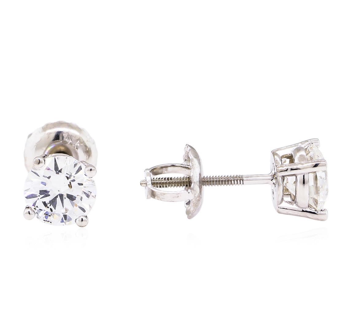 One pair electronically tested 14KT white gold lady's combination cast & assembled stud earrings with threaded posts and screw-on/screw-off backs with a bright polish finish. Identified with markings of "14K". Condition is new, good workmanship. Containing: Two prong set round brilliant cut diamonds, measuring 5.25 - 5.15 x 3.33mm (depth est.) approximate total weight of 2 Stones = 1.10ct. Graded in the setting. Clarity: SI-1 to SI-2. Color: F - Very Good. Total Weight of Diamonds 1.10ct. Total Weight of Earrings 1.00gm. GAS Appraised.