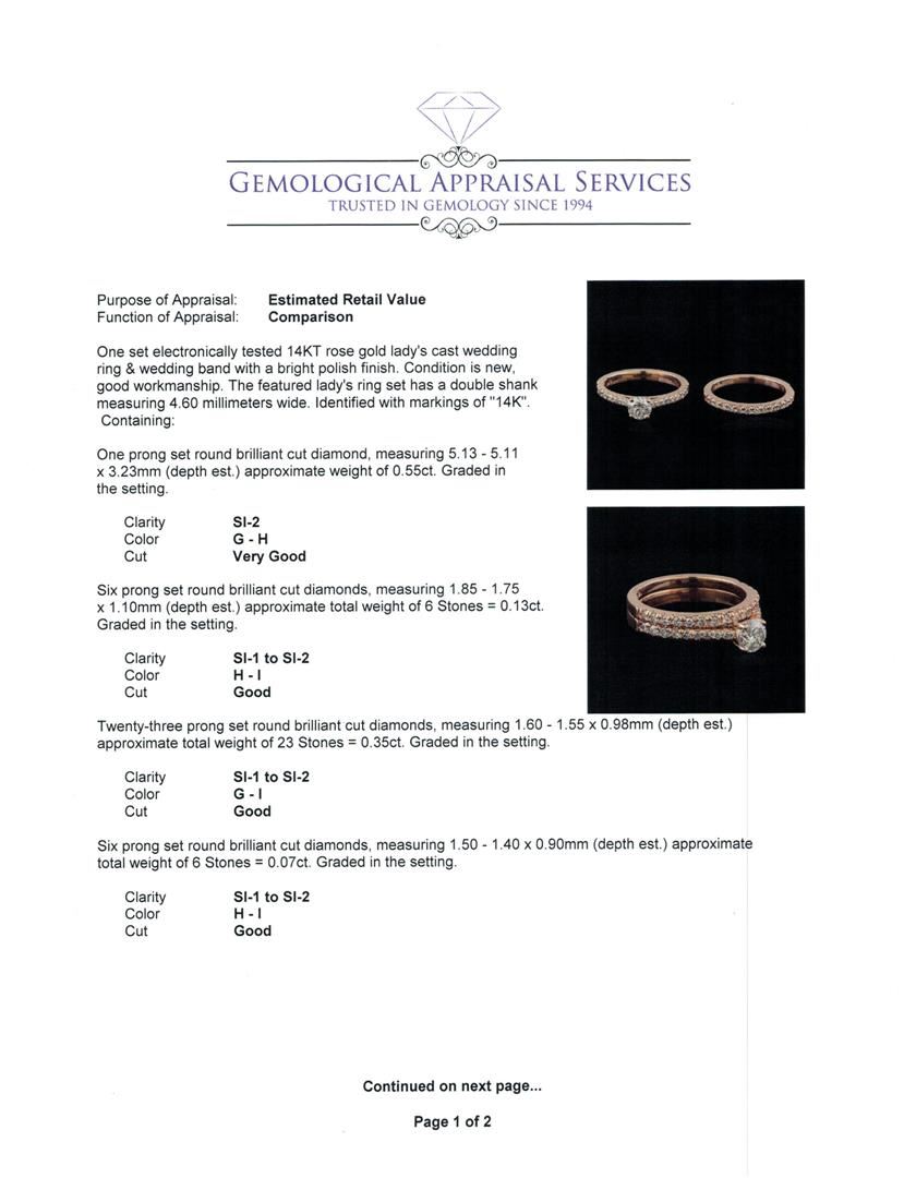 One set electronically tested 14KT rose gold lady's cast wedding ring & wedding band with a bright polish finish. The featured lady's ring set has a double shank measuring 4.60 millimeters wide. Identified with markings of "14K". Condition is new, good workmanship. Containing: One prong set round brilliant cut diamond, measuring 5.13 - 5.11 x 3.23mm (depth est.) approximate weight of 0.55ct. Graded in the setting. Clarity: SI-2. Color: G - Very Good Six prong set round brilliant cut diamonds, measuring 1.85 - 1.75 x 1.10mm (depth est.) approximate total weight of 6 Stones = 0.13ct. Graded in the setting. Clarity: SI-1 to SI-2. Color: H - I. Cut Good Twenty-Three prong set round brilliant cut diamonds, measuring 1.60 - 1.55 x 0.98mm (depth est.) approximate total weight of 23 Stones = 0.35ct. Graded in the setting. Clarity: SI-1 to SI-2. Color: G - I. Cut Good Six prong set round brilliant cut diamonds, measuring 1.50 - 1.40 x 0.90mm (depth est.) approximate total weight of 6 Stones = 0.07ct. Graded in the setting. Clarity: SI-1 to SI-2. Color: H - I. Cut Good. Total Weight of Diamonds 1.10ct. Total Weight of Ring & Wedding Band 5.60gm. GAS Appraised at $6,490.00.