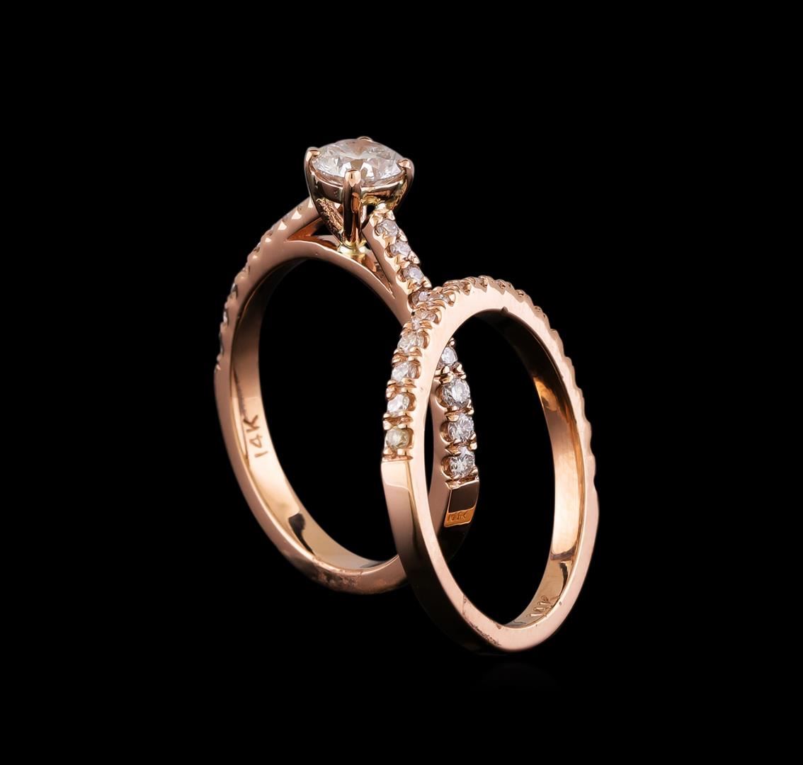 One set electronically tested 14KT rose gold lady's cast wedding ring & wedding band with a bright polish finish. The featured lady's ring set has a double shank measuring 4.60 millimeters wide. Identified with markings of "14K". Condition is new, good workmanship. Containing: One prong set round brilliant cut diamond, measuring 5.13 - 5.11 x 3.23mm (depth est.) approximate weight of 0.55ct. Graded in the setting. Clarity: SI-2. Color: G - Very Good Six prong set round brilliant cut diamonds, measuring 1.85 - 1.75 x 1.10mm (depth est.) approximate total weight of 6 Stones = 0.13ct. Graded in the setting. Clarity: SI-1 to SI-2. Color: H - I. Cut Good Twenty-Three prong set round brilliant cut diamonds, measuring 1.60 - 1.55 x 0.98mm (depth est.) approximate total weight of 23 Stones = 0.35ct. Graded in the setting. Clarity: SI-1 to SI-2. Color: G - I. Cut Good Six prong set round brilliant cut diamonds, measuring 1.50 - 1.40 x 0.90mm (depth est.) approximate total weight of 6 Stones = 0.07ct. Graded in the setting. Clarity: SI-1 to SI-2. Color: H - I. Cut Good. Total Weight of Diamonds 1.10ct. Total Weight of Ring & Wedding Band 5.60gm. GAS Appraised at $6,490.00.