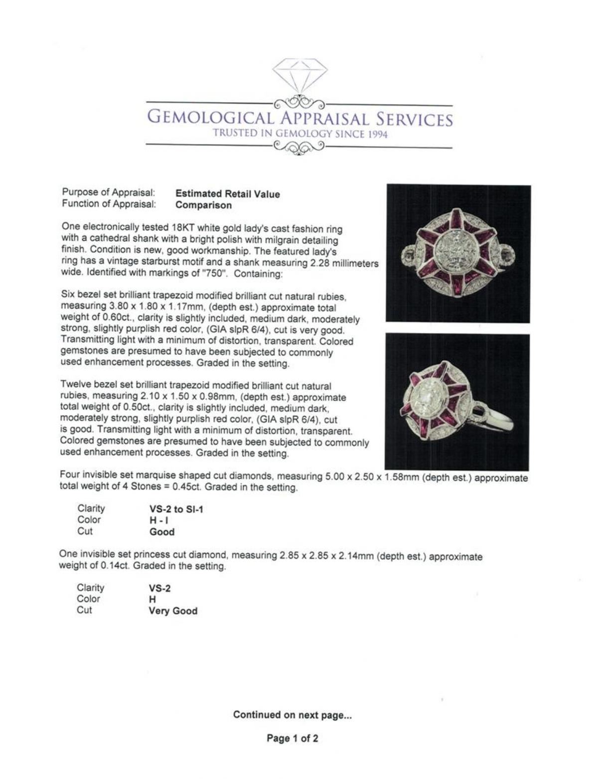 One electronically tested 18KT white gold lady's cast fashion ring with a cathedral shank with a bright polish with milgrain detailing finish. The featured lady's ring has a vintage starburst motif and a shank measuring 2.28 millimeters wide. Identified with markings of '750'. Condition is new, good workmanship. Containing: Six bezel set brilliant trapezoid modified brilliant cut natural rubies, measuring 3.80 x 1.80 x 1.17mm, (depth est.) approximate total weight of 0.60ct., clarity is slightly included, medium dark, moderately strong, slightly purplish red color, (GIA slpR 6/4), cut is very good. Transmitting light with a minimum of distortion, transparent. Colored gemstones are presumed to have been subjected to commonly used enhancement processes. Graded in the setting. Twelve bezel set brilliant trapezoid modified brilliant cut natural rubies, measuring 2.10 x 1.50 x 0.98mm, (depth est.) approximate total weight of 0.50ct., clarity is slightly included, medium dark, moderately strong, slightly purplish red color, (GIA slpR 6/4), cut is good. Transmitting light with a minimum of distortion, transparent. Colored gemstones are presumed to have been subjected to commonly used enhancement processes. Graded in the setting. Four invisible set marquise shaped cut diamonds, measuring 5.00 x 2.50 x 1.58mm (depth est.) approximate total weight of 4 Stones = 0.45ct. Graded in the setting. Clarity VS-2 to SI-1. Color: H - I Cut Good One invisible set princess cut diamond, measuring 2.85 x 2.85 x 2.14mm (depth est.) approximate weight of 0.14ct. Graded in the setting. Clarity VS-2. Color: H Cut Very Good Eighteen bead set round brilliant cut diamonds, measuring 1.30 - 1.20 x 0.78mm (depth est.) approximate total weight of 18 Stones = 0.13ct. Graded in the setting. Clarity VS-1 to VS-2. Color: G - H Cut Very Good Eighteen prong set round brilliant cut diamonds, measuring 0.90 - 0.85 x 0.55mm (depth est.) approximate total weight of 18 Stones = 0.05ct. Graded in the setting. Clarity VS-2 to SI-1. Color: G - H Cut Very Good. Total Weight of Colored Stones 1.10ct.. Total Weight of Diamonds 0.77ct.. Total Weight of Ring 6.50gm. GAS Appraised.