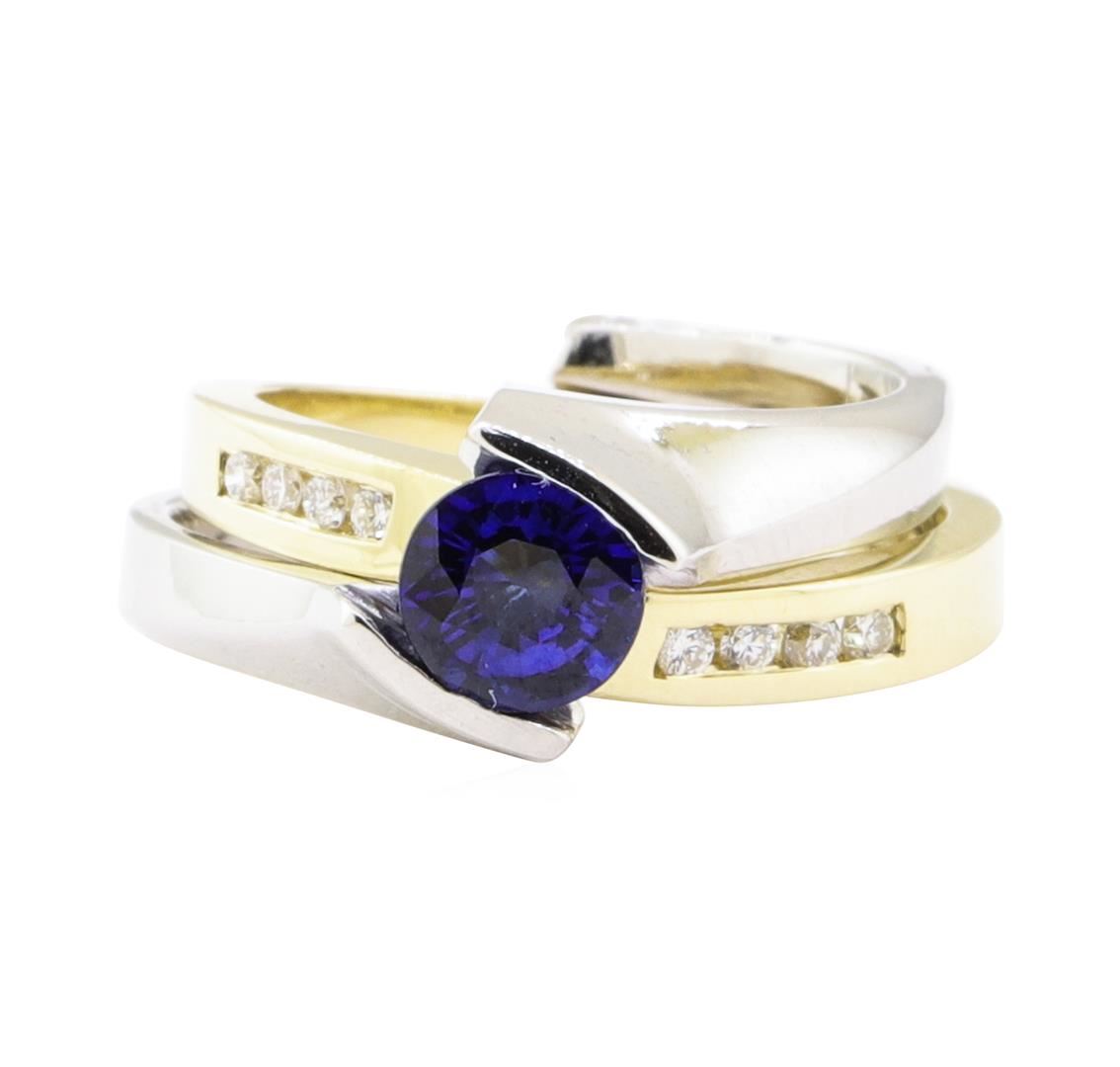 One ring set featuring: 14KT yellow and white gold weighing 7.6 grams containing one sapphire weighing 0.85ctw and diamonds weighing 0.25ctw.