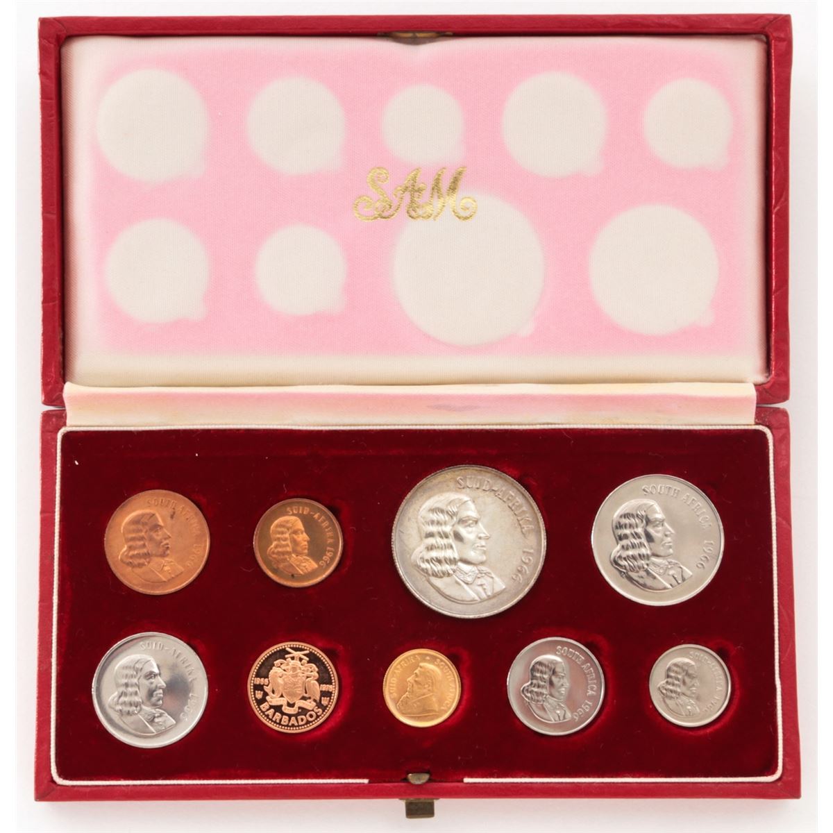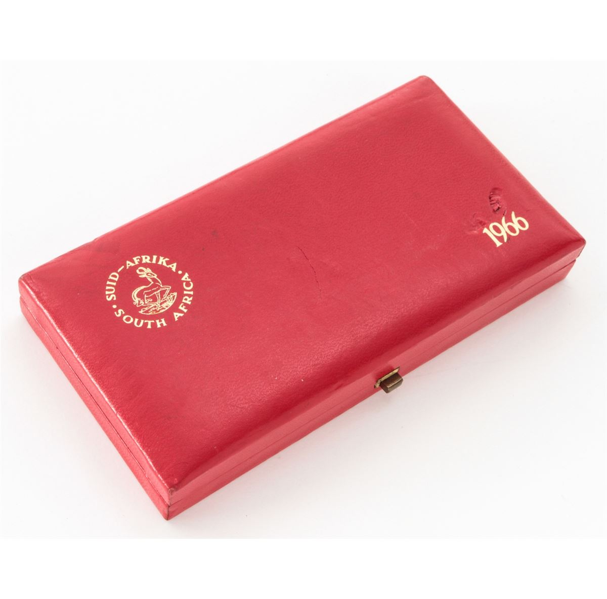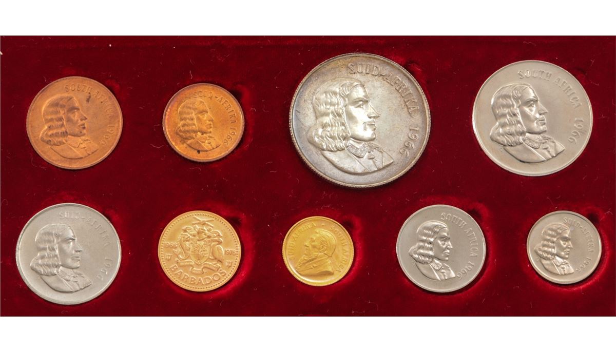 1/10 oz. 1982 dated Gold Krugerrand, in 1966 South African 9-Coin Proof Set. Most show tarnish, but Krugerrand is excellent, in red leather case. Est.: $300-$400/set.