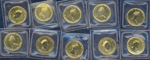 1/10 oz Maple Leaf 1999 with 20 Year Privy Mark. Lot of 10 coins for a total of 1 oz pure gGold.