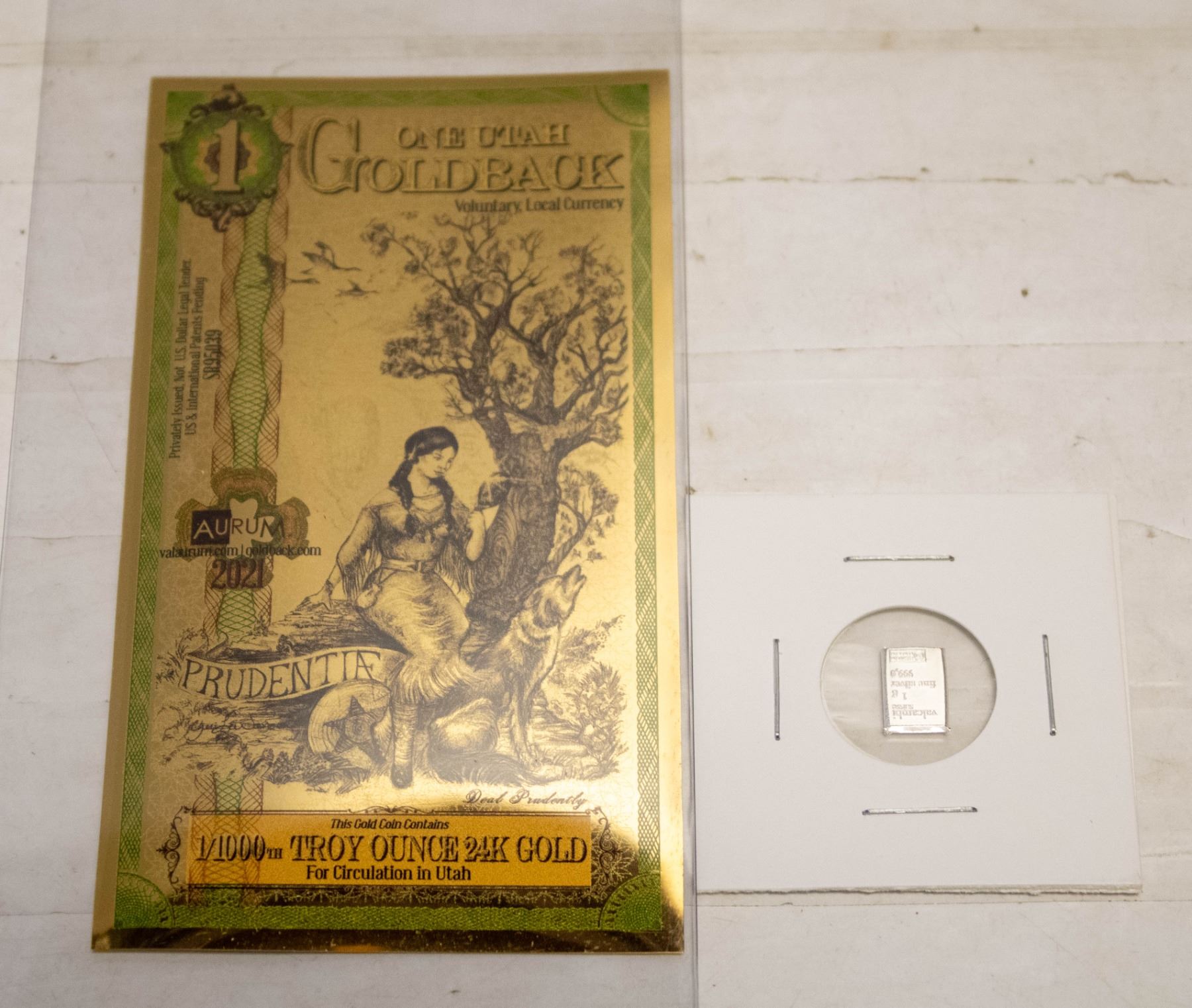 1/1000 TROY OUNCE 24K GOLD UTAH GOLDBACK NOTE AND A 1g VALCAMBI SUISSE .999 SILVER BAR