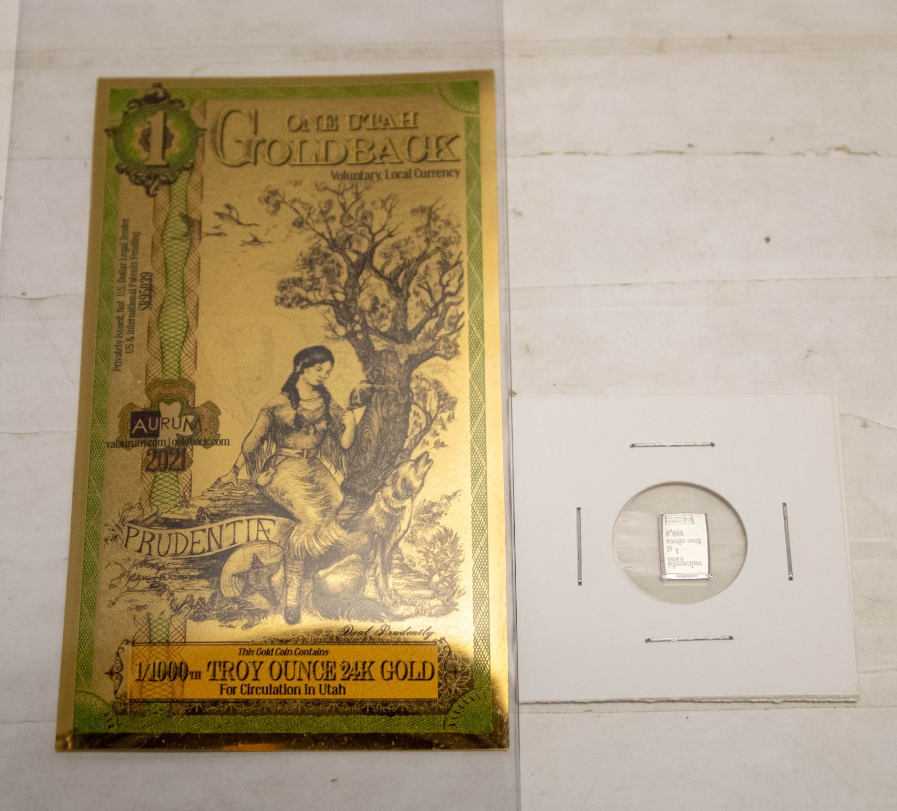 1/1000 TROY OUNCE 24K GOLD UTAH GOLDBACK NOTE AND A 1g VALCAMBI SUISSE .999 SILVER BAR