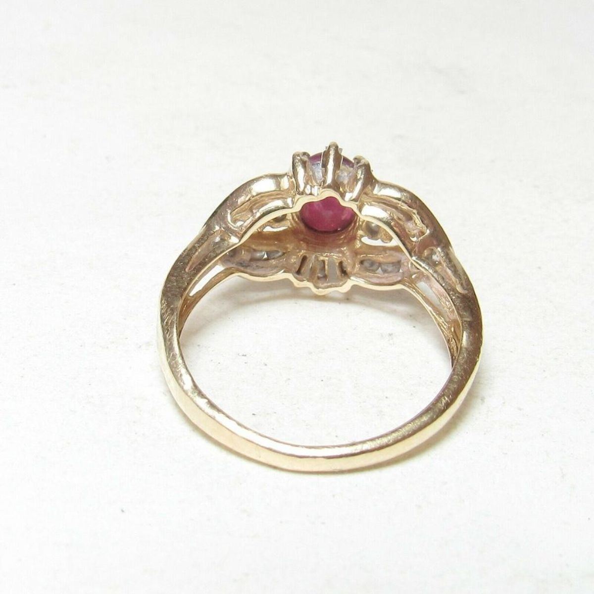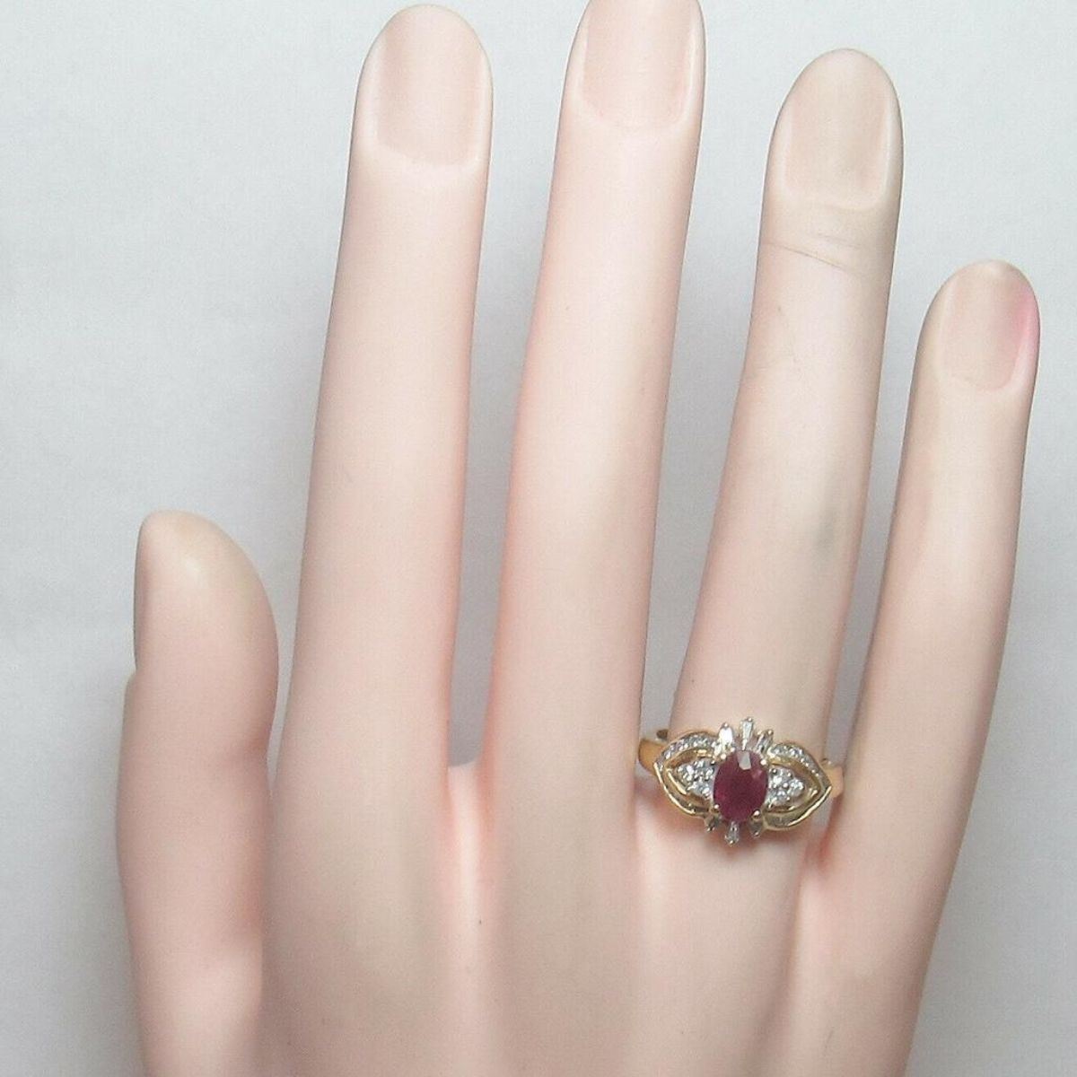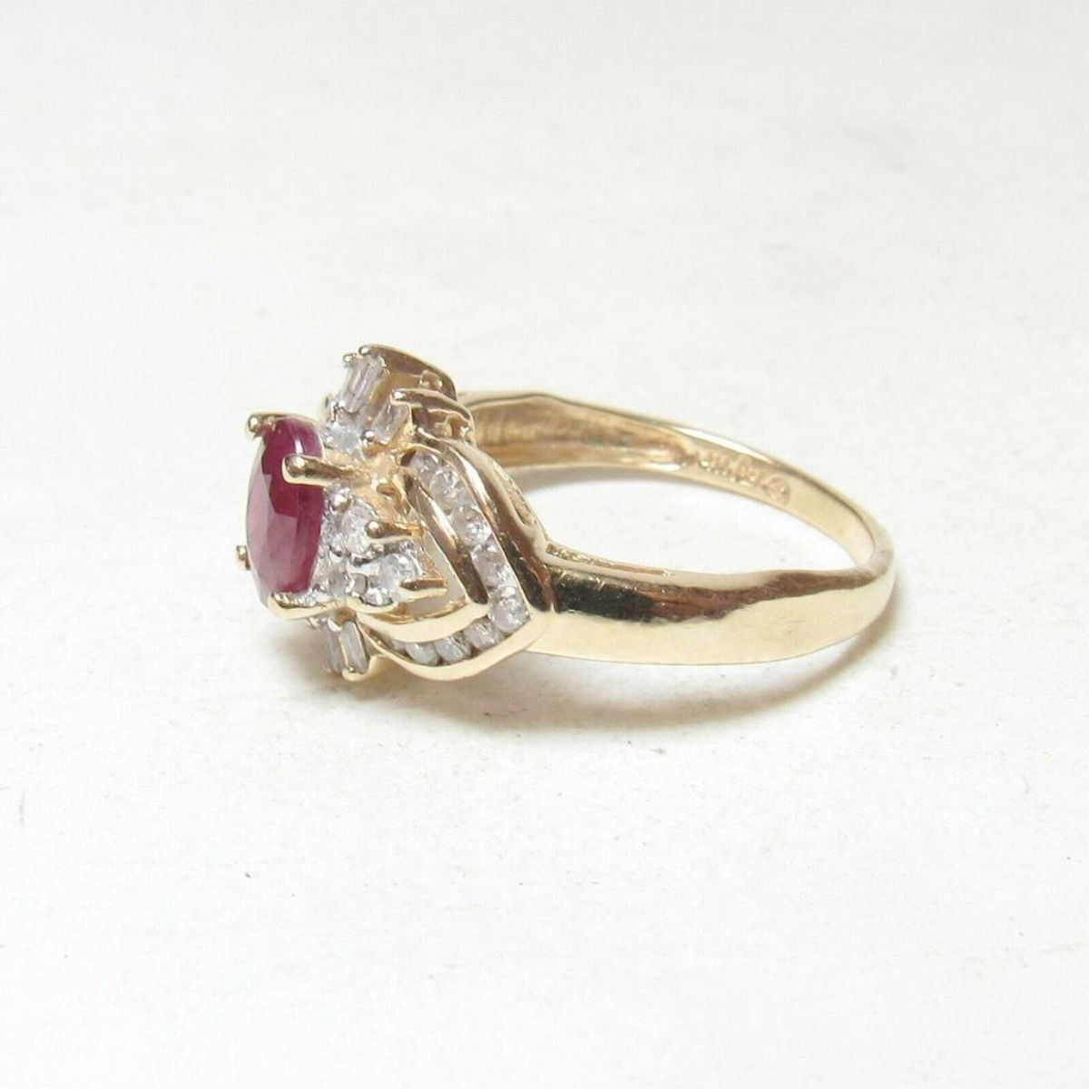 Beautiful estate halo style ring with 1.10ct oval faceted natural red ruby gemstone ( with internal flaws ) enhanced with 6 baguette & 24 brilliant-cut diamonds ( I1 clarity, with some I2 with various internal flaws ) & I in color. Approx total weight 0.50cts. Size 7.25.