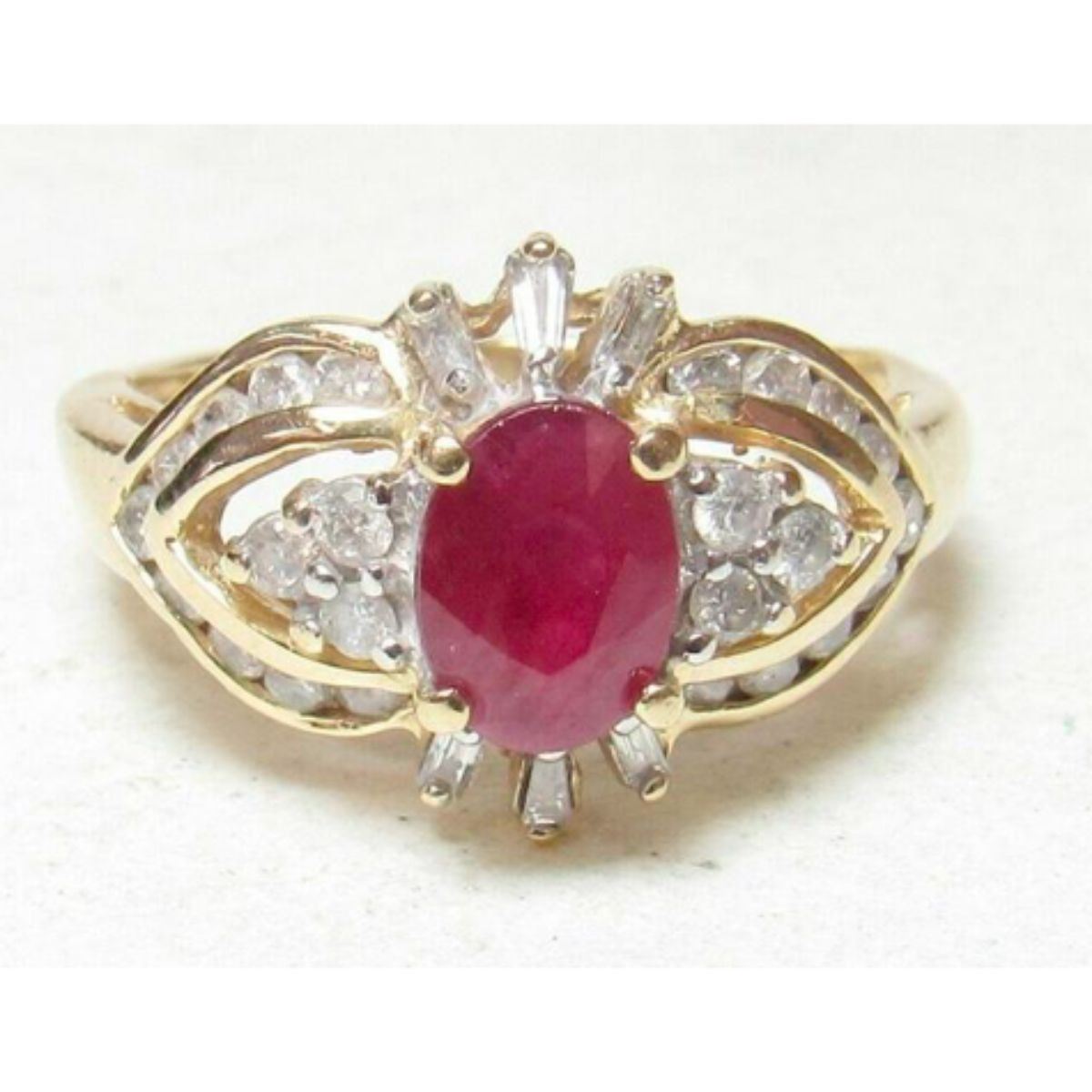 Beautiful estate halo style ring with 1.10ct oval faceted natural red ruby gemstone ( with internal flaws ) enhanced with 6 baguette & 24 brilliant-cut diamonds ( I1 clarity, with some I2 with various internal flaws ) & I in color. Approx total weight 0.50cts. Size 7.25.