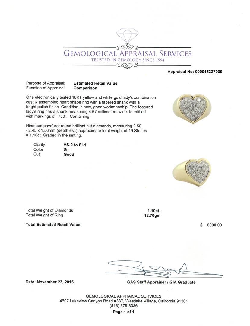 One electronically tested 18KT yellow and white gold lady's combination cast & assembled heart shape ring with a tapered shank with a bright polish finish. The featured lady's ring has a shank measuring 4.67 millimeters wide. Identified with markings of "750". Condition is new, good workmanship. Containing: Nineteen pave' set round brilliant cut diamonds, measuring 2.50 - 2.45 x 1.56mm (depth est.) approximate total weight of 19 Stones = 1.10ct. Graded in the setting. Clarity: VS-2 to SI-1. Color: G - I. Cut Good. Total Weight of Diamonds 1.10ct. Total Weight of Ring 12.70gm. GAS Appraised at $5,090.00.