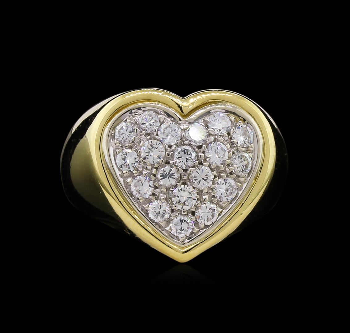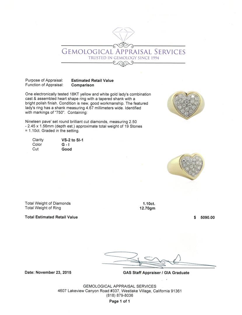 One electronically tested 18KT yellow and white gold lady's combination cast & assembled heart shape ring with a tapered shank with a bright polish finish. The featured lady's ring has a shank measuring 4.67 millimeters wide. Identified with markings of "750". Condition is new, good workmanship. Containing: Nineteen pave' set round brilliant cut diamonds, measuring 2.50 - 2.45 x 1.56mm (depth est.) approximate total weight of 19 Stones = 1.10ct. Graded in the setting. Clarity: VS-2 to SI-1. Color: G - I. Cut Good. Total Weight of Diamonds 1.10ct. Total Weight of Ring 12.70gm. GAS Appraised at $5,090.00.