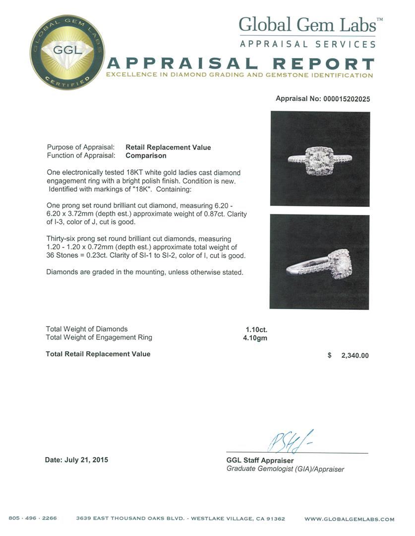 One electronically tested 18KT white gold ladies cast diamond engagement ring with a bright polish finish. Identified with markings of "18K". Condition is new. Containing: One prong set round brilliant cut diamond, measuring 6.20 - 6.20 x 3.72mm (depth est.) approximate weight of 0.87ct. Clarity: I-3. Color: J, Cut is Good. Thirty-Six prong set round brilliant cut diamonds, measuring 1.20 - 1.20 x 0.72mm (depth est.) approximate total weight of 36 Stones = 0.23ct. Clarity: SI-1 to SI-2. Color: I, Cut is Good. Diamonds are graded in the mounting, unless otherwise stated. Total Weight of Diamonds 1.10ct. Total Weight of Engagement Ring 4.10gm. GGL Appraised at $2,340.00.