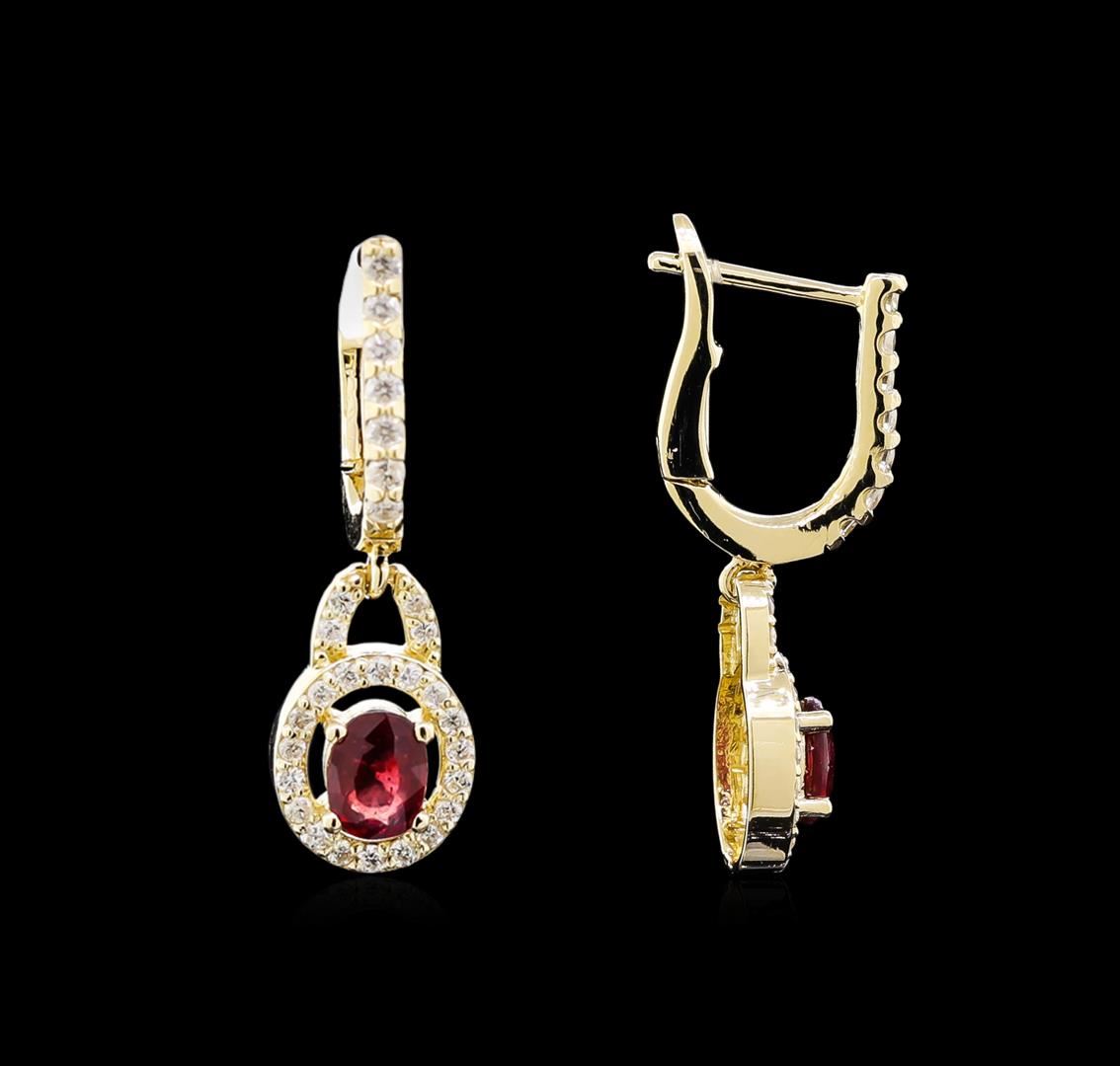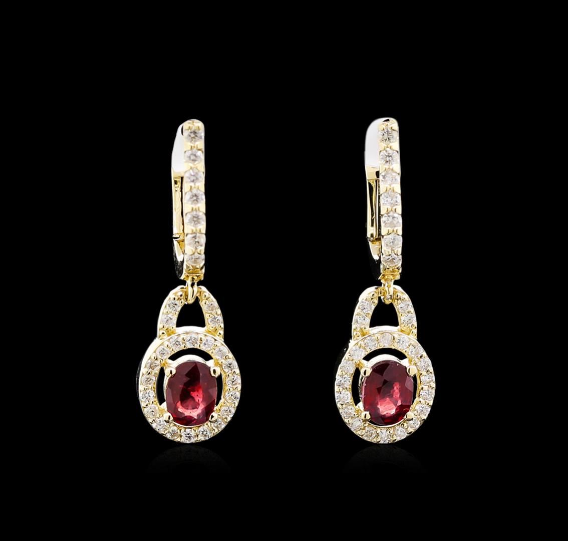 One pair of earrings featuring: 14KT yellow gold weighing 3.55 grams containing two rubies with a total weight of 1.10ct and diamonds with a total weight of 0.49ct.