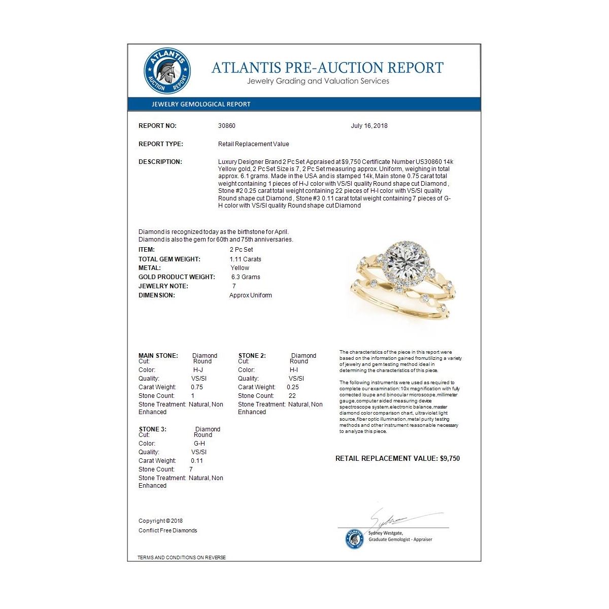 REF-197W3F -30860 ---- 1.11 CTW Certified VS/SI Diamond 2Pc Wedding Set Solitaire Halo 14K Yellow Gold ---- Luxury Designer Brand 2 Pc Set Appraised at $9,750 Certificate Number US30860 14k Yellow gold, 2 Pc Set Size is 7, 2 Pc Set measuring approx. Uniform, weighing in total approx. 6.1 grams. Made in the USA and is stamped 14k, Main stone 0.75 carat total weight containing 1 pieces of H-J color with VS/SI quality Round shape cut Diamond , Stone #2 0.25 carat total weight containing 22 pieces of H-I color with VS/SI quality Round shape cut Diamond , Stone #3 0.11 carat total weight containing 7 pieces of G-H color with VS/SI quality Round shape cut Diamond