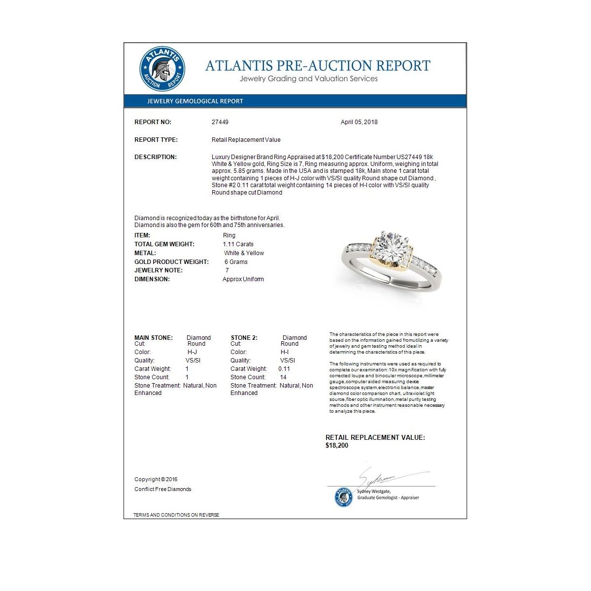 REF-367T3M -27449 ---- 1.11 CTW Certified VS/SI Diamond Solitaire Ring 18K White & Yellow Gold ---- Luxury Designer Brand Ring Appraised at $18,200 Certificate Number US27449 18k White & Yellow gold, Ring Size is 7, Ring measuring approx. Uniform, weighing in total approx. 5.85 grams. Made in the USA and is stamped 18k, Main stone 1 carat total weight containing 1 pieces of H-J color with VS/SI quality Round shape cut Diamond , Stone #2 0.11 carat total weight containing 14 pieces of H-I color with VS/SI quality Round shape cut Diamond