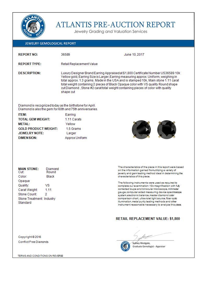 1.11 CTW Fancy Black VS Diamond Solitaire Stud Earrings 10K Yellow Gold ---- Luxury Designer Brand Earring Appraised Retail Price at $1,800 ---- SKU Number US36589 10k Yellow gold Earring Size is Larger, Earring measuring approx. Uniform, weighing in total approx. 1.3 grams. Made in the USA and is stamped 10k, Main stone 1.11 carat total weight containing 2 pieces of Black Opaque color with VS quality Round shape cut Diamond , Stone #2 carat total weight containing pieces of color with quality shape cut