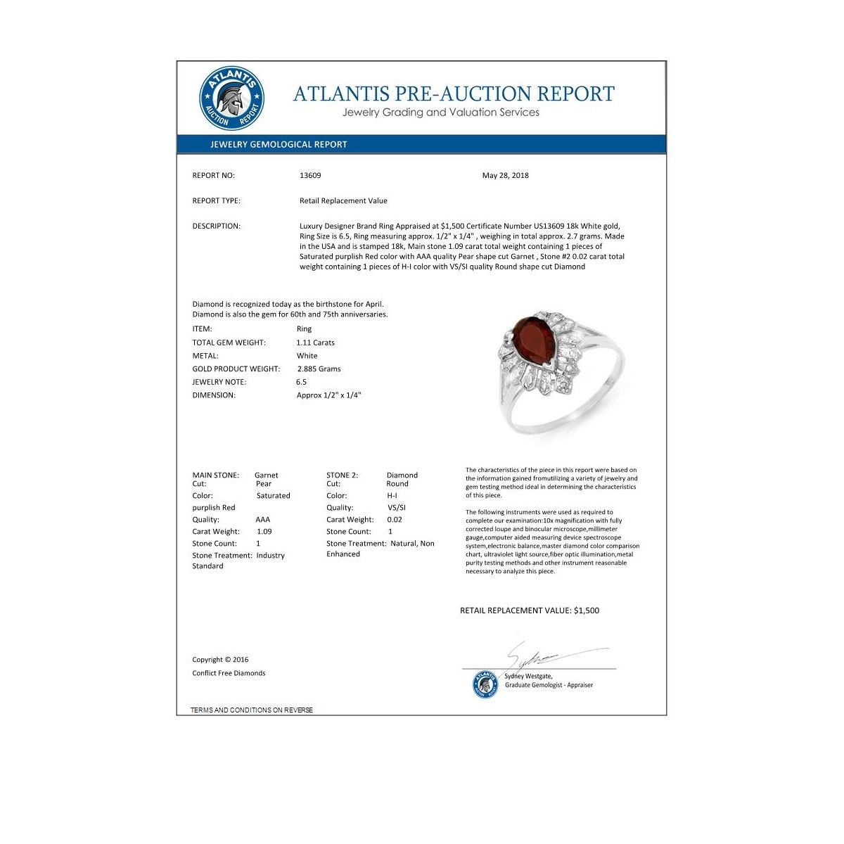 REF-24N8Y -13609 ---- 1.11 CTW Garnet & Diamond Ring 18K White Gold ---- Luxury Designer Brand Ring Appraised at $1,500 Certificate Number US13609 18k White gold, Ring Size is 6.5, Ring measuring approx. 1/2" x 1/4" , weighing in total approx. 2.7 grams. Made in the USA and is stamped 18k, Main stone 1.09 carat total weight containing 1 pieces of Saturated purplish Red color with AAA quality Pear shape cut Garnet , Stone #2 0.02 carat total weight containing 1 pieces of H-I color with VS/SI quality Round shape cut Diamond