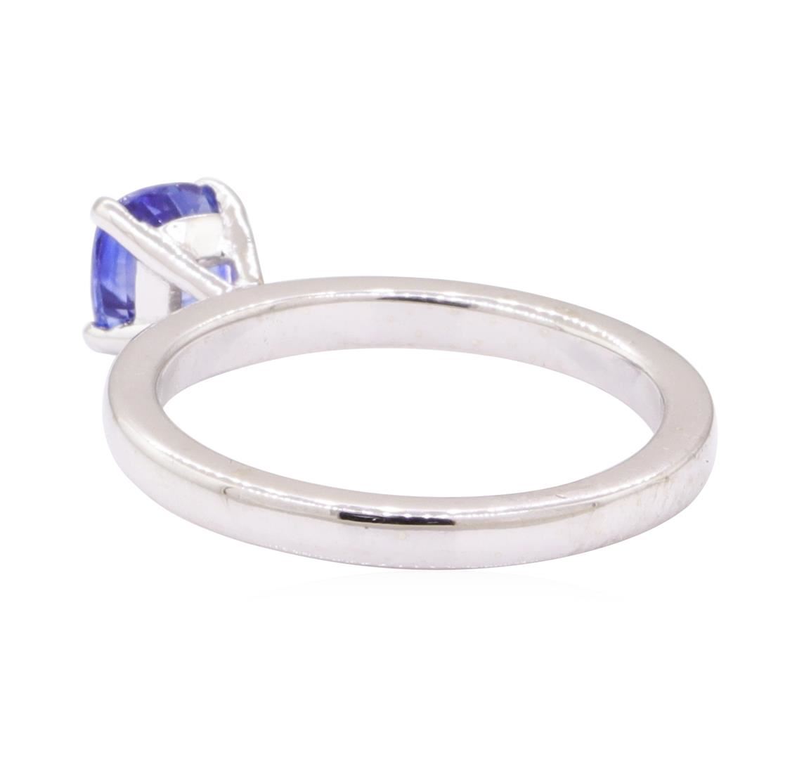 One ring featuring: 14KT white gold weighing 2.6 grams containing one cushion cut blue sapphire weighing 1.11ct. The ring is a half dome solitaire ring with a shank measuring 2.0 millimeters wide.