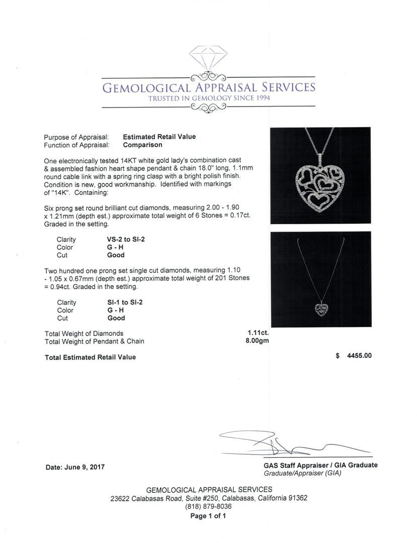 One electronically tested 14KT white gold lady's combination cast & assembled fashion heart shape pendant & chain 18.0' long, 1.1mm round cable link with a spring ring clasp with a bright polish finish. Identified with markings of '14K'. Condition is new, good workmanship. Containing: Six prong set round brilliant cut diamonds, measuring 2.00 - 1.90 x 1.21mm (depth est.) approximate total weight of 6 Stones = 0.17ct. Graded in the setting. Color G - H Clarity VS-2 to SI-2 Cut Good Two Hundred One prong set single cut diamonds, measuring 1.10 - 1.05 x 0.67mm (depth est.) approximate total weight of 201 Stones = 0.94ct. Graded in the setting. Color G - H Clarity SI-1 to SI-2 Cut Good. Total Weight of Diamonds 1.11ct.. Total Weight of Pendant & Chain 8.00gm GAS Appraised at $4455.00. GAS Appraised at $4,455.00.