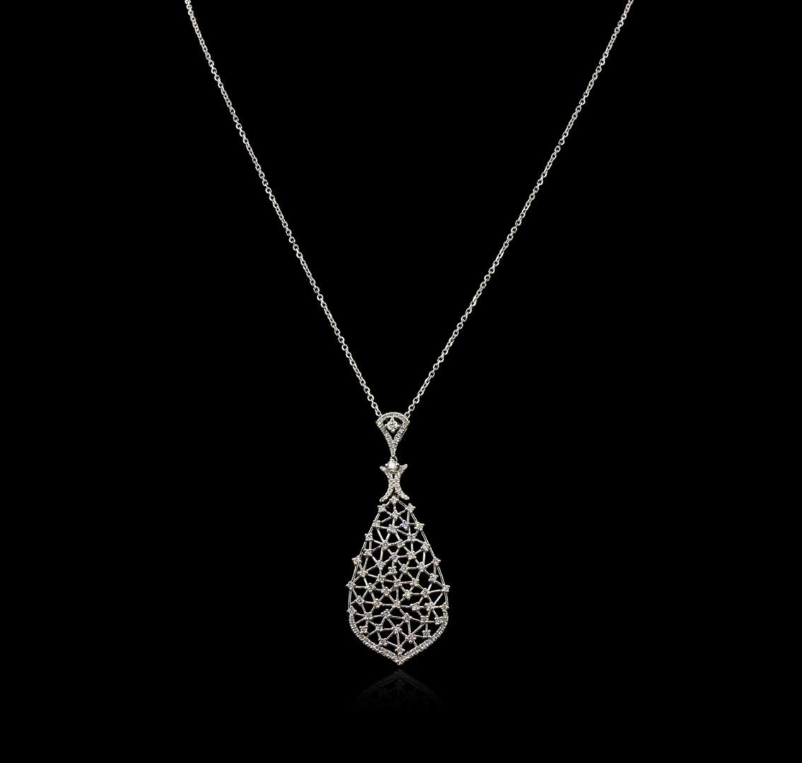 One electronically tested 14KT white gold lady's combination cast & assembled tear drop pendant & chain 18.0" long, 1.0mm diamond cut cable link with a spring ring clasp with a bright polish finish. Identified with markings of "585". Condition is new, good workmanship. Containing: Two prong set round brilliant cut diamonds, measuring 2.40 - 2.35 x 1.55mm (depth est.) approximate. Total Weight of 2 Stones = 0.11ct. Graded in the setting. Clarity: SI-2. Color: I. Cut Good Fifty-Two prong set round brilliant cut diamonds, measuring 1.60 - 1.55 x 1.00mm (depth est.) approximate. Total Weight of 52 Stones = 0.75ct. Graded in the setting. Clarity: SI-2 to I-1. Color: H - Good Sixty-Three prong set round brilliant cut diamonds, measuring 1.00 - 0.95 x 0.64mm (depth est.) approximate. Total Weight of 63 Stones = 0.25ct. Graded in the setting. Clarity: SI-2 to I-1. Color: H - Good. Total Weight of Diamonds 1.11ct. Total Weight of Pendant & Chain 9.30gm. GAS Appraised at $4,405.00.