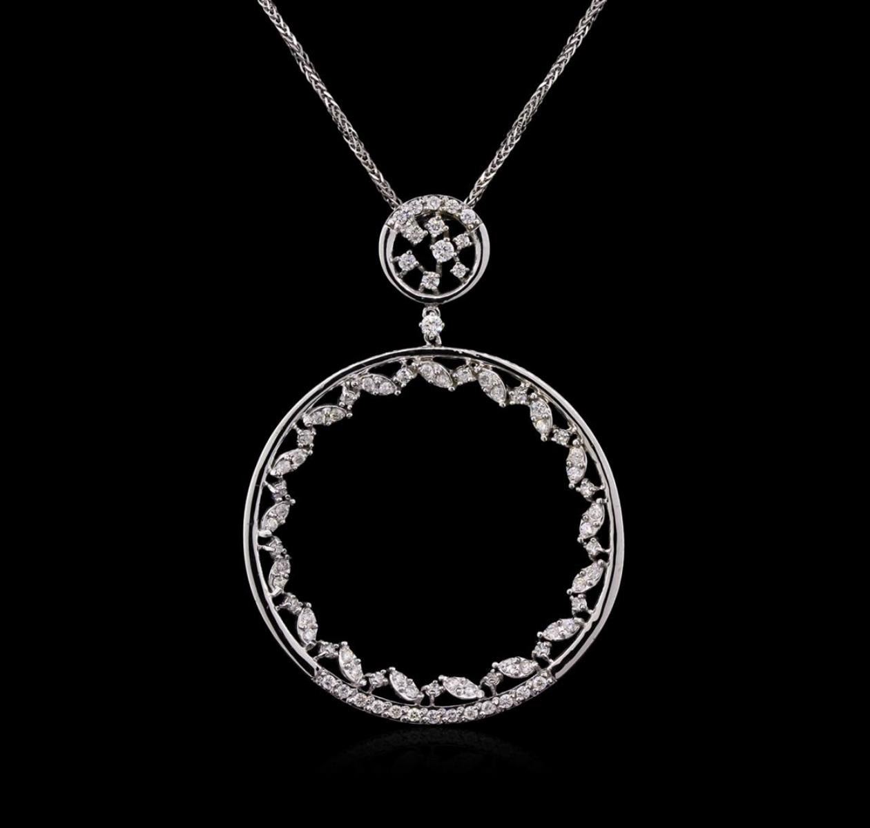 One electronically tested 14KT white gold lady's combination cast & assembled circle pendant & chain 18.0" long, 1.4mm square wheat link with a lobster claw clasp with a bright polish finish. Identified with markings of "14K". Condition is new, good workmanship. Containing: Two prong set round brilliant cut diamonds, measuring 2.30 - 2.20 x 1.46mm (depth est.) approximate total weight of 2 Stones = 0.10ct. Graded in the setting. Clarity: SI-1 . Color: H - I. Cut Good Seventy-Five prong set round brilliant cut diamonds, measuring 1.60 - 1.45 x 0.95mm (depth est.) approximate total weight of 75 Stones = 1.01ct. Graded in the setting. Clarity: SI-1 to SI-2 . Color: H - I. Cut Good. Total Weight of Diamonds 1.11ct.. Total Weight of Pendant & Chain 9.50gm at $ 4705.00 GAS Appraised.