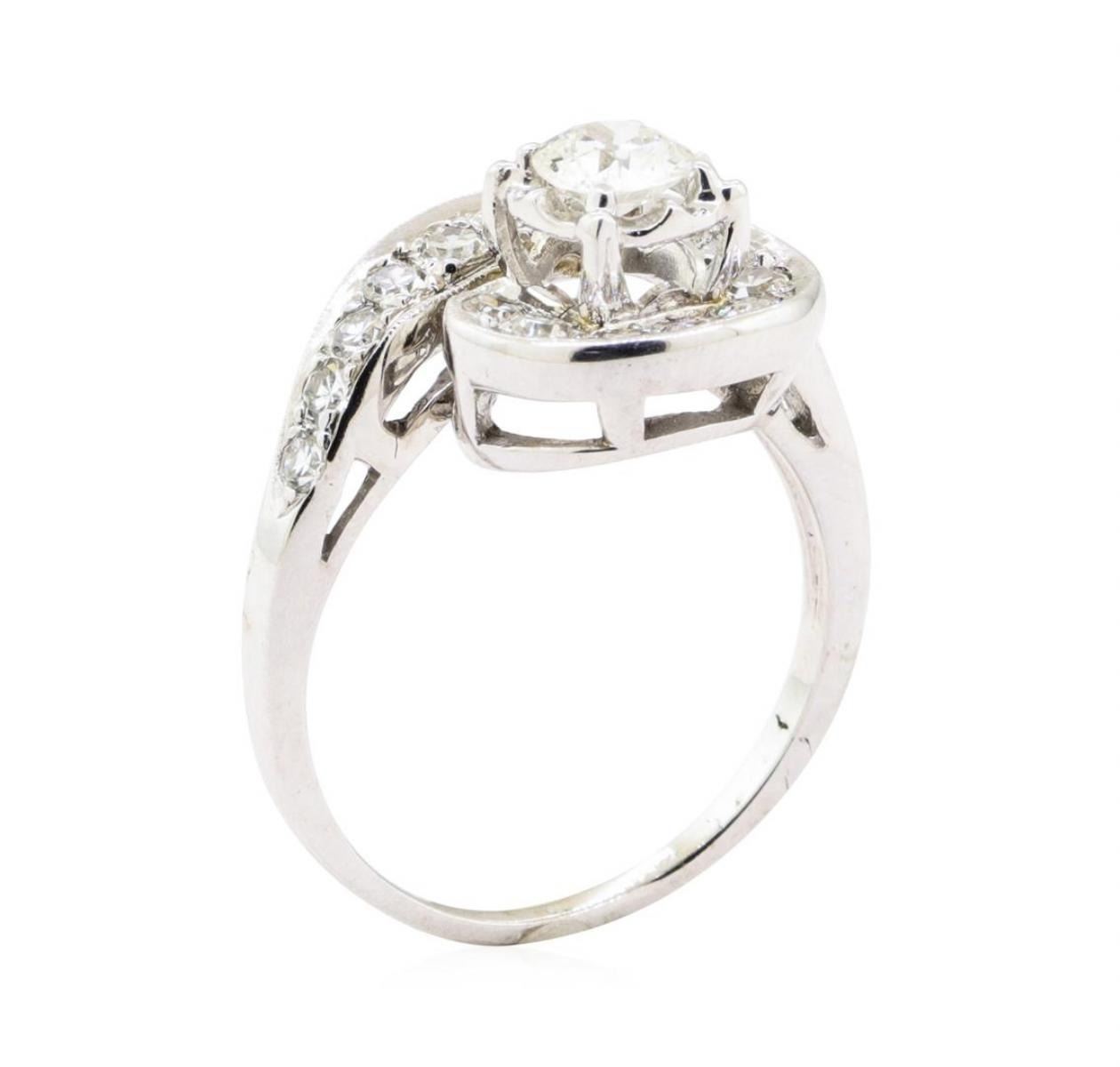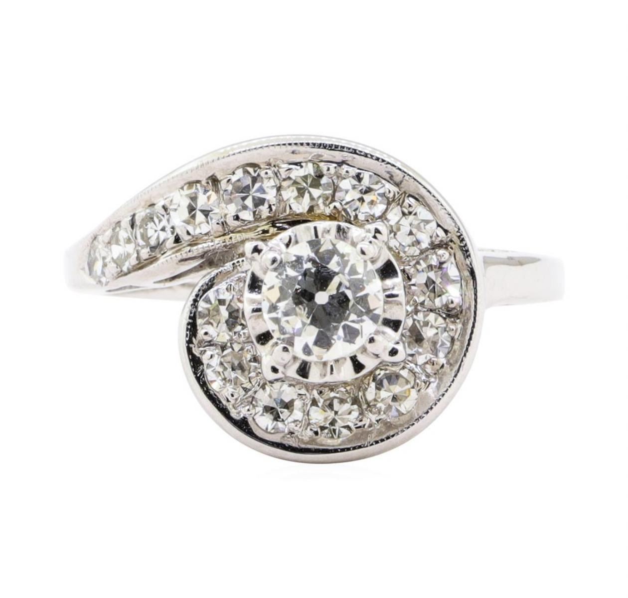 One electronically tested 14KT white gold lady's cast fashion ring with a bypass swirl with a bright polish with milgrain detailing finish. The featured lady's ring has a shank measuring 1.30 millimeters wide. Identified with markings of '14K'. Condition is Good. Containing: One prong set old mine cut diamond, measuring 4.97 - 4.95 x 3.08mm (depth est.) approximate weight of 0.51ct. Graded in the setting. The diamond is set in a miracle head setting. Color I Clarity SI-1 Cut Very Good Fifteen prong set single cut diamonds, measuring 2.30 - 2.10 x 1.36mm (depth est.) approximate total weight of 15 Stones = 0.60ct. Graded in the setting. Color H - I Clarity VS-1 to SI-1 Cut Good. Total Weight of Diamonds 1.11ct.. Total Weight of Ring 4.80gm GAS Appraised at $4530.00. GAS Appraised.