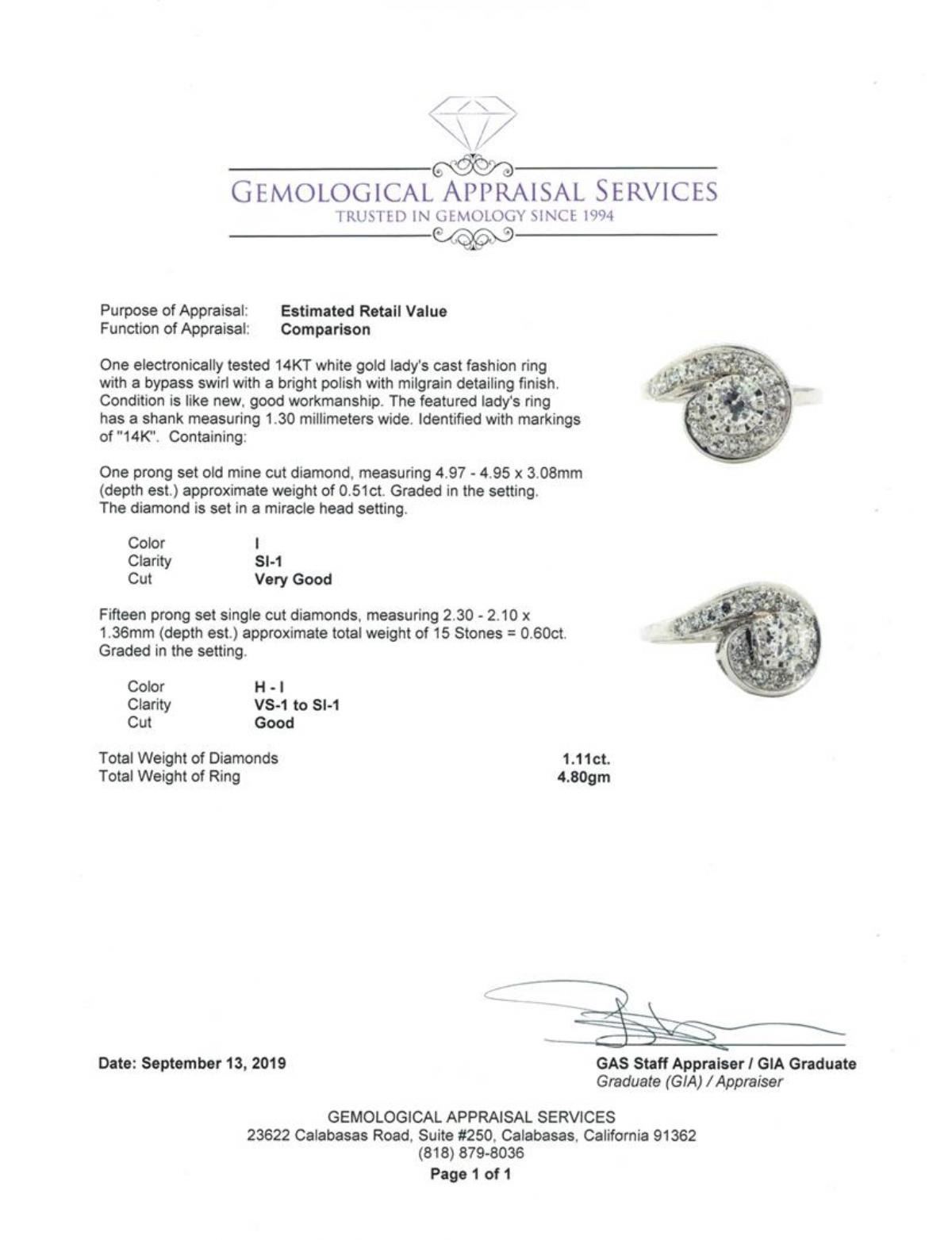 One electronically tested 14KT white gold lady's cast fashion ring with a bypass swirl with a bright polish with milgrain detailing finish. The featured lady's ring has a shank measuring 1.30 millimeters wide. Identified with markings of '14K'. Condition is Good. Containing: One prong set old mine cut diamond, measuring 4.97 - 4.95 x 3.08mm (depth est.) approximate weight of 0.51ct. Graded in the setting. The diamond is set in a miracle head setting. Color I Clarity SI-1 Cut Very Good Fifteen prong set single cut diamonds, measuring 2.30 - 2.10 x 1.36mm (depth est.) approximate total weight of 15 Stones = 0.60 ct. Graded in the setting. Color H - I Clarity VS-1 to SI-1 Cut Good. Total Weight of Diamonds 1.11ct.. Total Weight of Ring 4.80gm GAS Appraised at $4530.00. GAS Appraised.